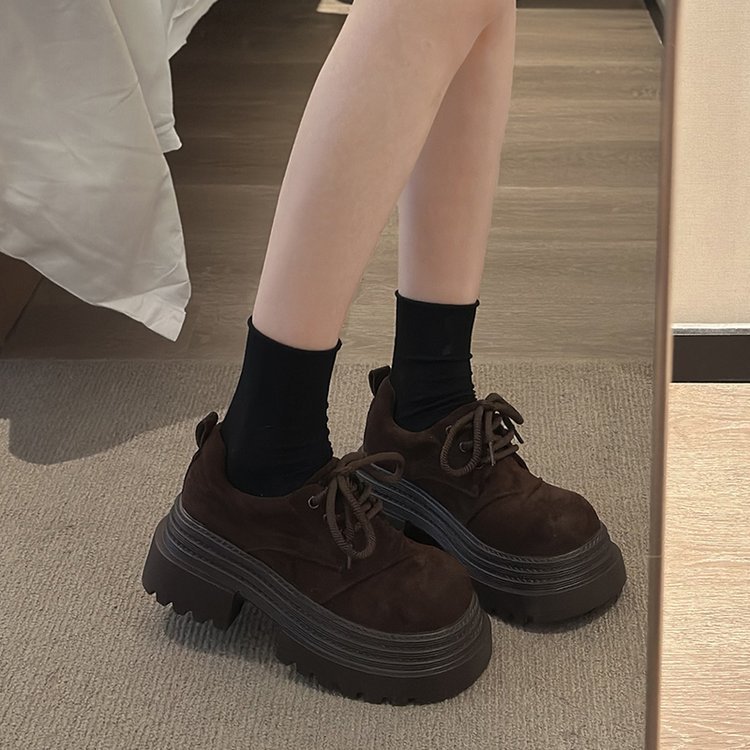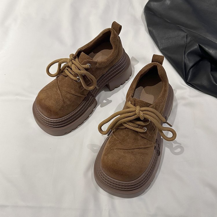 Женские лоферы на толстой подошве из матовой кожи с увеличением роста, на шнурках, новинка 2025 года, ретро-туфли с широким носком, однотонные маленькие кожаные туфли