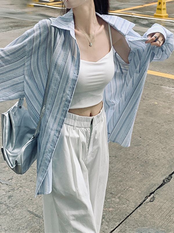 Главная страница > Синяя полосатая рубашка с длинным рукавом и воротником-поло, женская тонкая свободная Солнцезащитная рубашка средней длины на весну и осень
