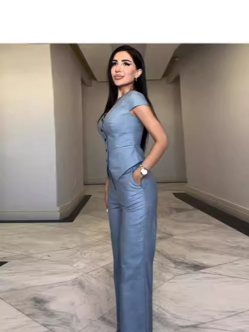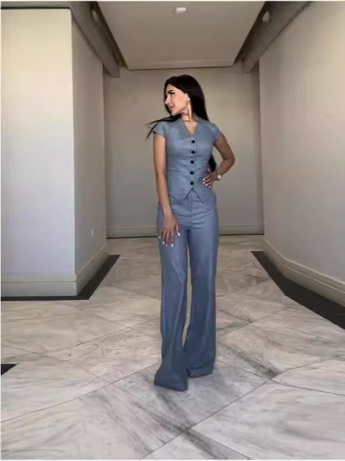 2024 Европейская и Американская трансграничная внешняя торговля Женская одежда высокого уровня сплошного цвета темперамент без рукавов V-образный топ повседневные прямые брюки