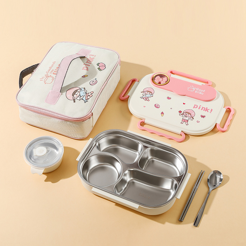 Розовая сетка для маленькой девочки из четырех частей★Одиночная упаковка + посуда + суповая тарелка + термосумка [316 антибактериальный]