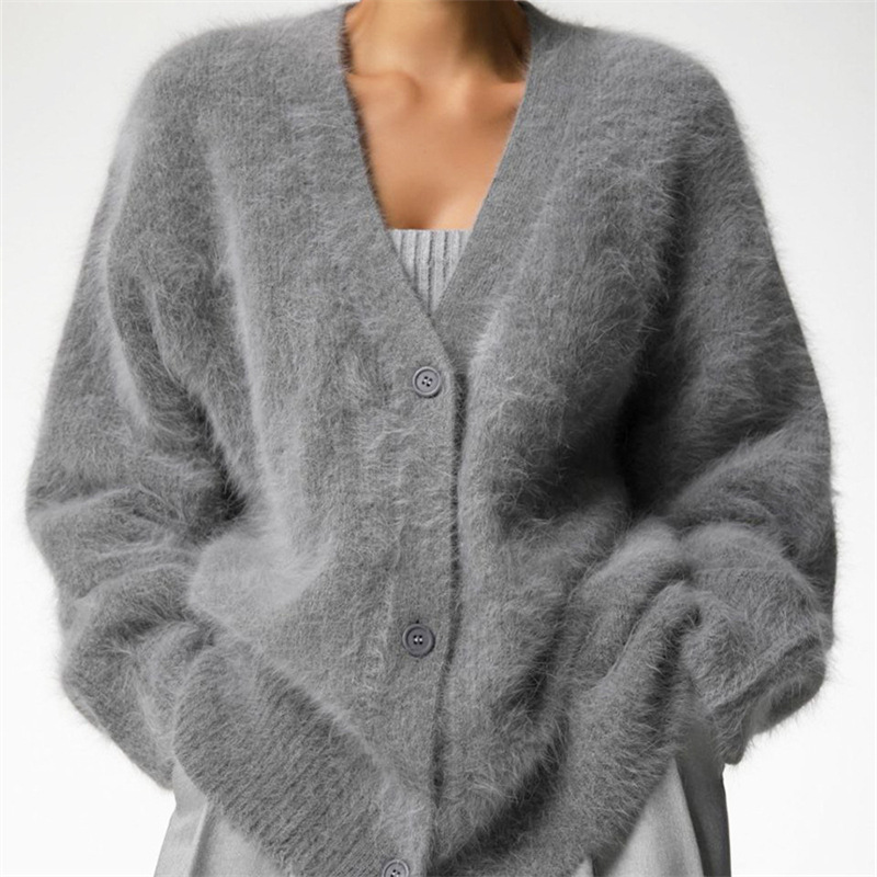 Главная страница > Трансграничный имитационный норковый шерсть вязаный шерстяной женский кардиган 2024 осень и зима ленивый ветер свободный длинный рукав V-образный свитер куртка для женщин