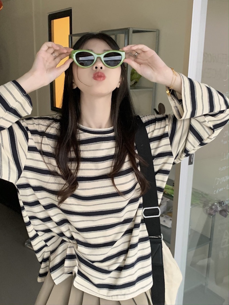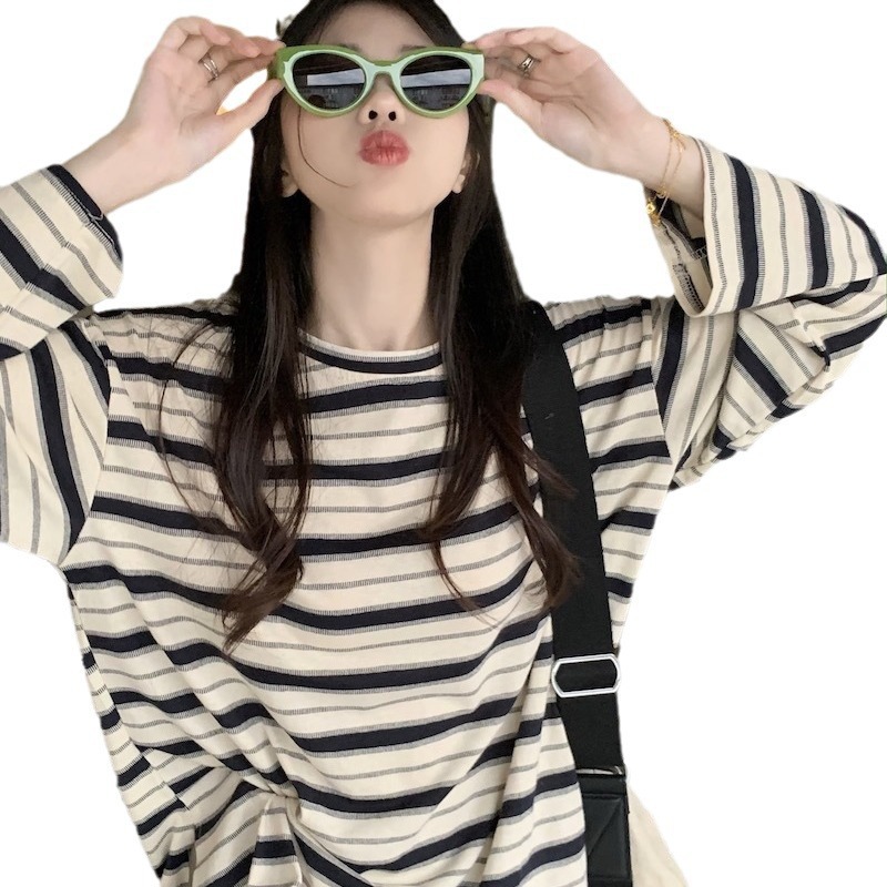 Главная страница > Женская футболка с круглым вырезом и длинными рукавами в полоску, новая модель осень-зима 2025, повседневный свободный крой, стройнящая, с разрезом
