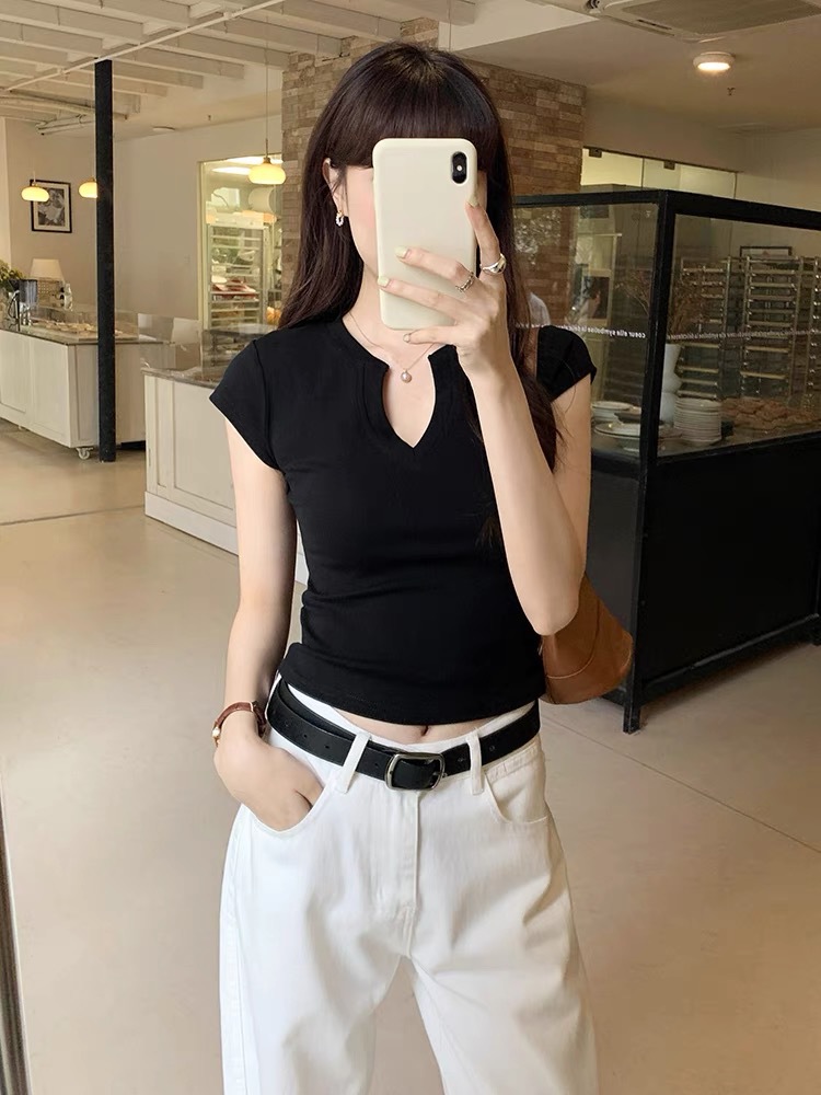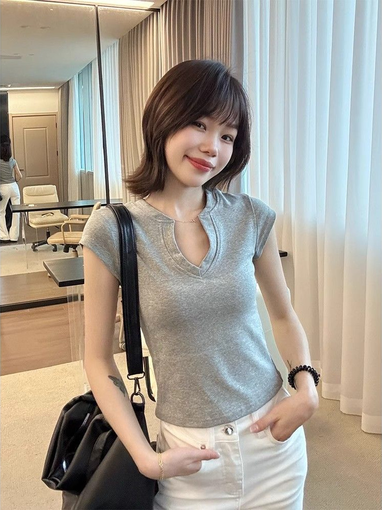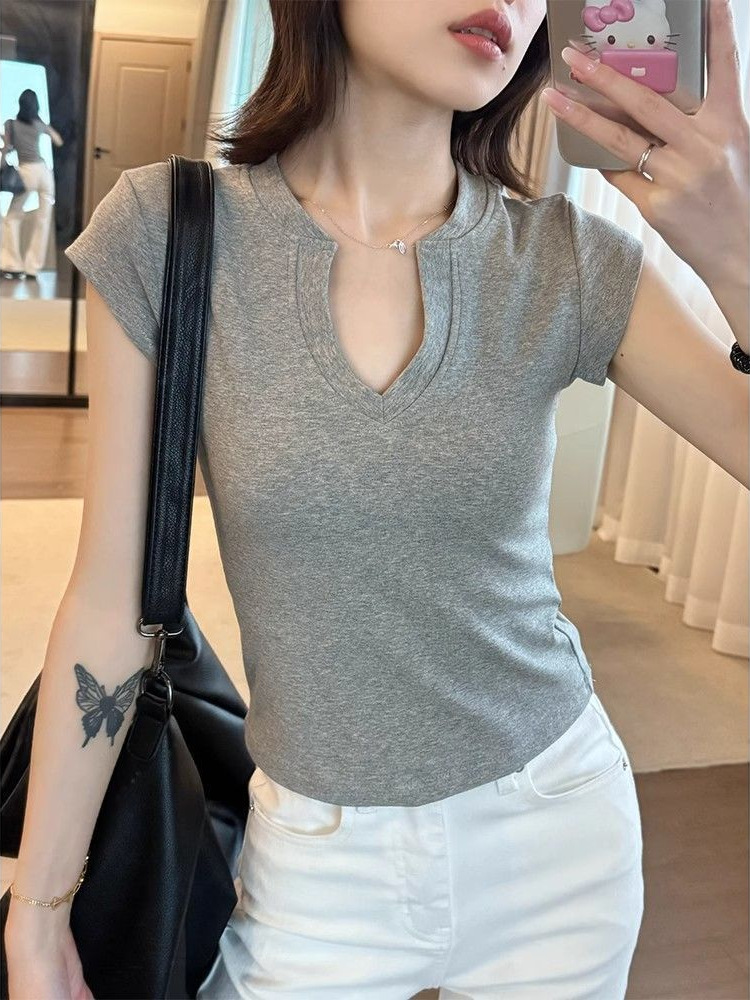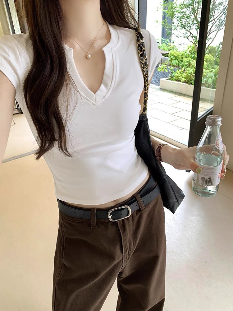 Главная страница > Прохладный и пряный V-образный воротник тонкое плечо с короткими рукавами футболка женская летняя новая нишевая уникальная шикарная короткая топ