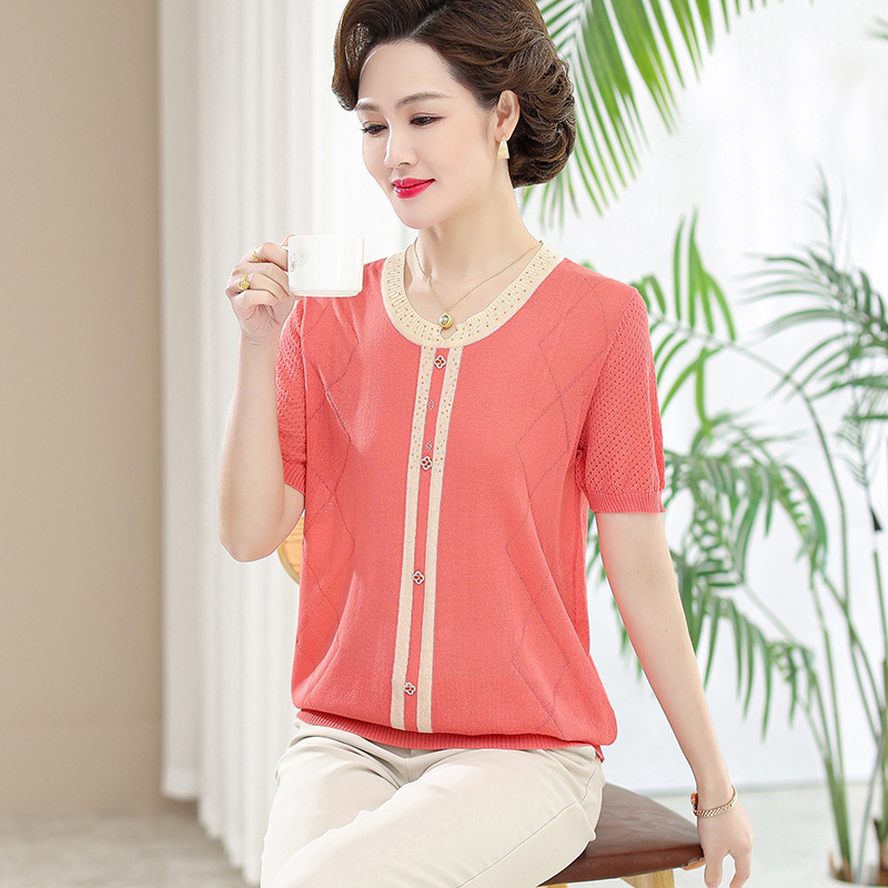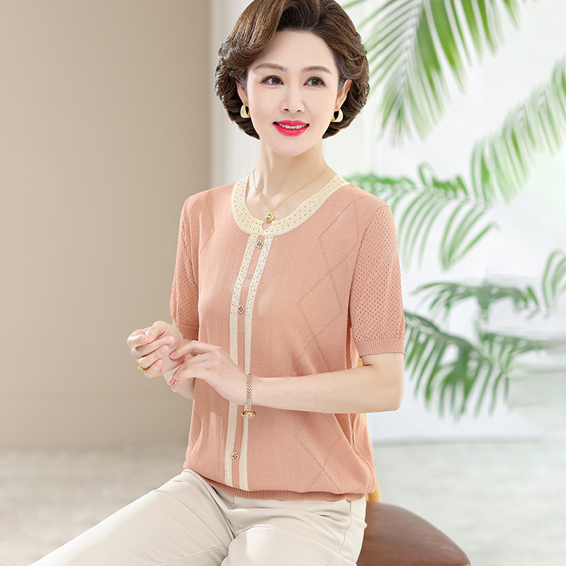 Главная страница > Летнее платье для матери, стилизованная футболка из ледяного шелка с круглым вырезом и короткими рукавами, тонкий Топ для женщин среднего возраста для 50 лет, маленькая рубашка