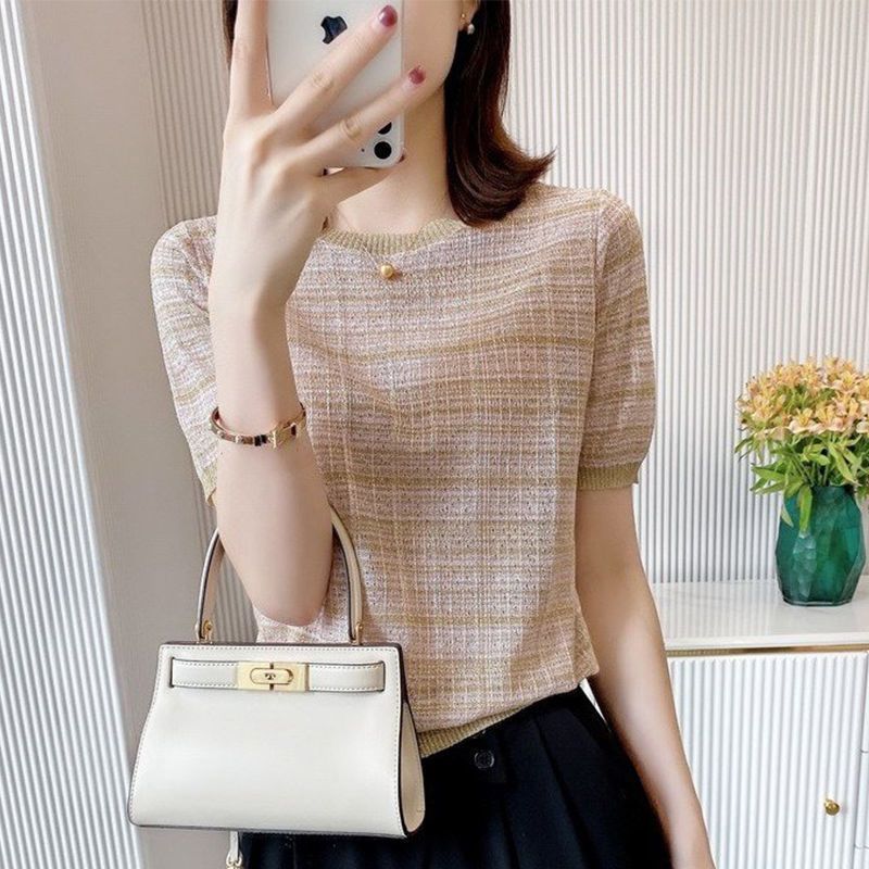 Главная страница > Летняя тонкая ледяная шелковая женская футболка с короткими рукавами 2025 новый дизайн в полоску свободная выдолбленная трикотажная нижняя рубашка