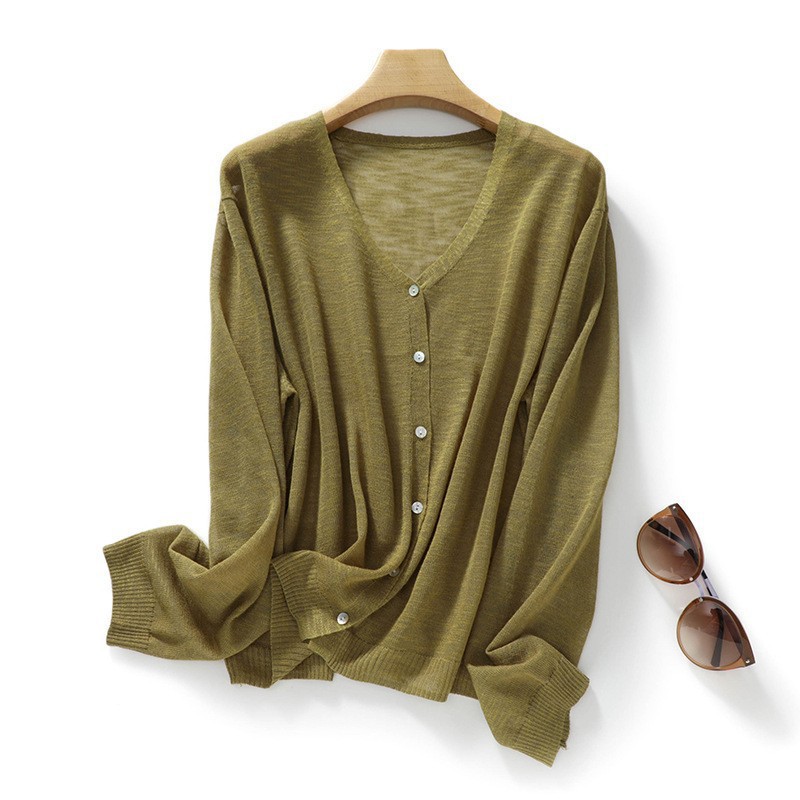 2024 Летний солнцезащитный крем рубашка с кондиционером бамбуковый конопля трикотажный кардиган для женщин Тонкий круглый шею куртка из ледяного шелка рыхлый топ для женщин