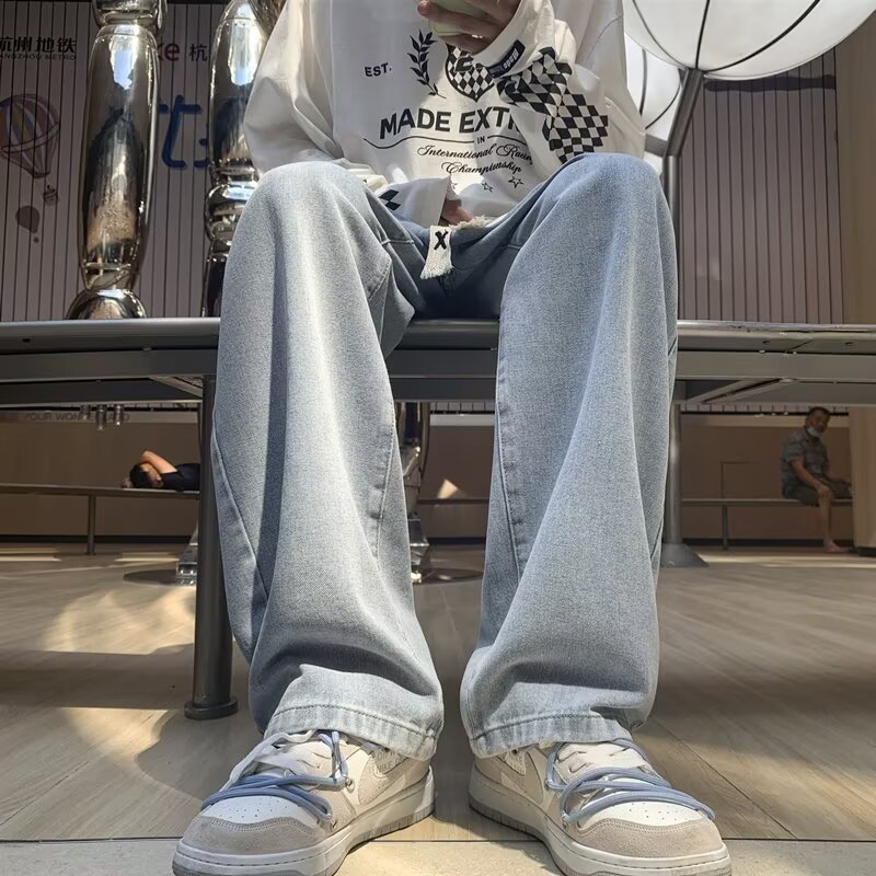 Главная страница > Мужские свободные прямые модные широкие летние повседневные джинсы в пол с эластичным поясом на шнурке, оптом
