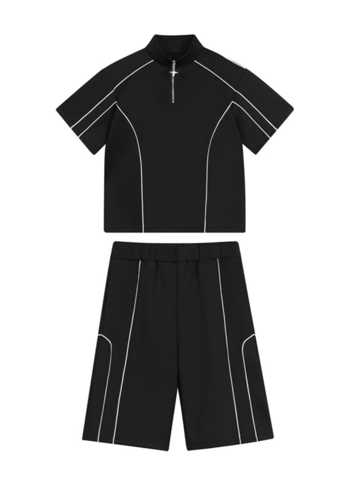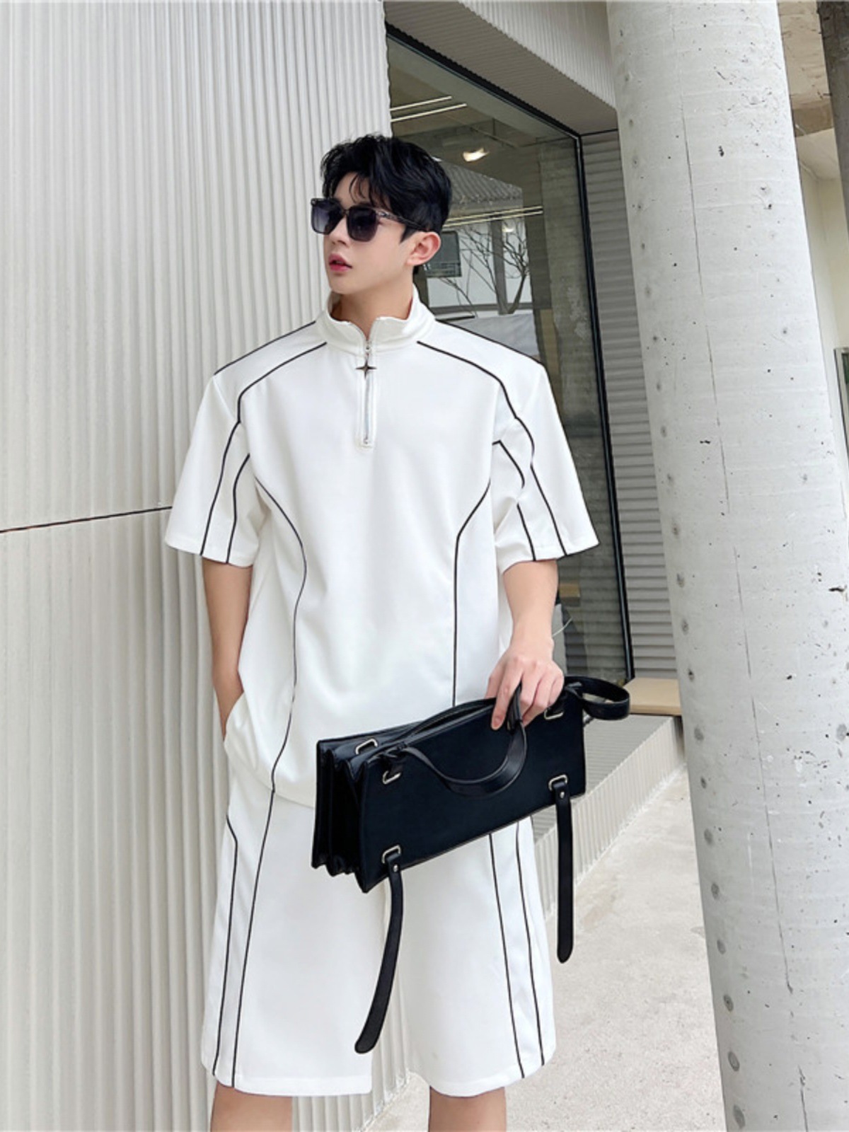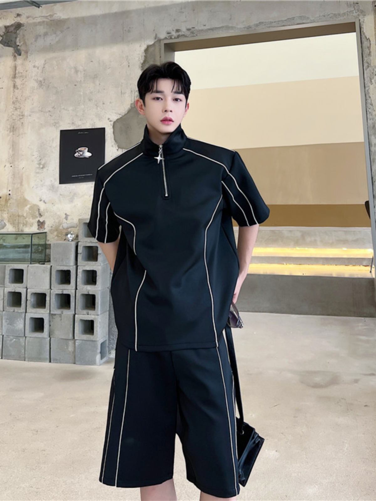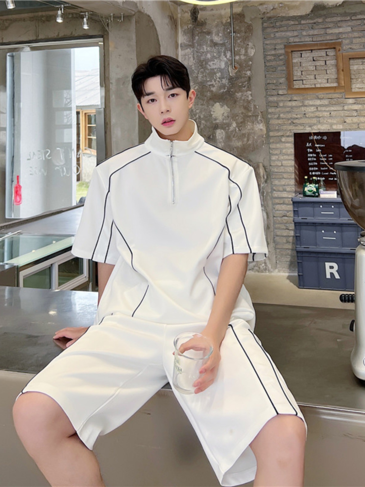 Летний премиум-комфорт красивый и повседневный спортивный набор мужской корейской версии свободной футболки на молнии, нишевые шорты из двух частей