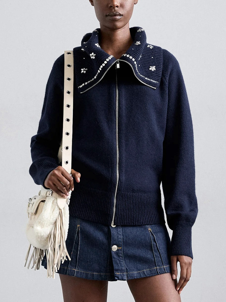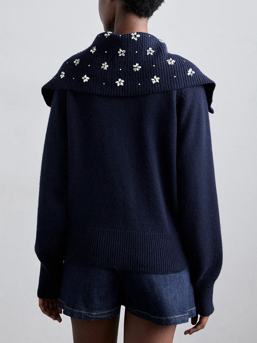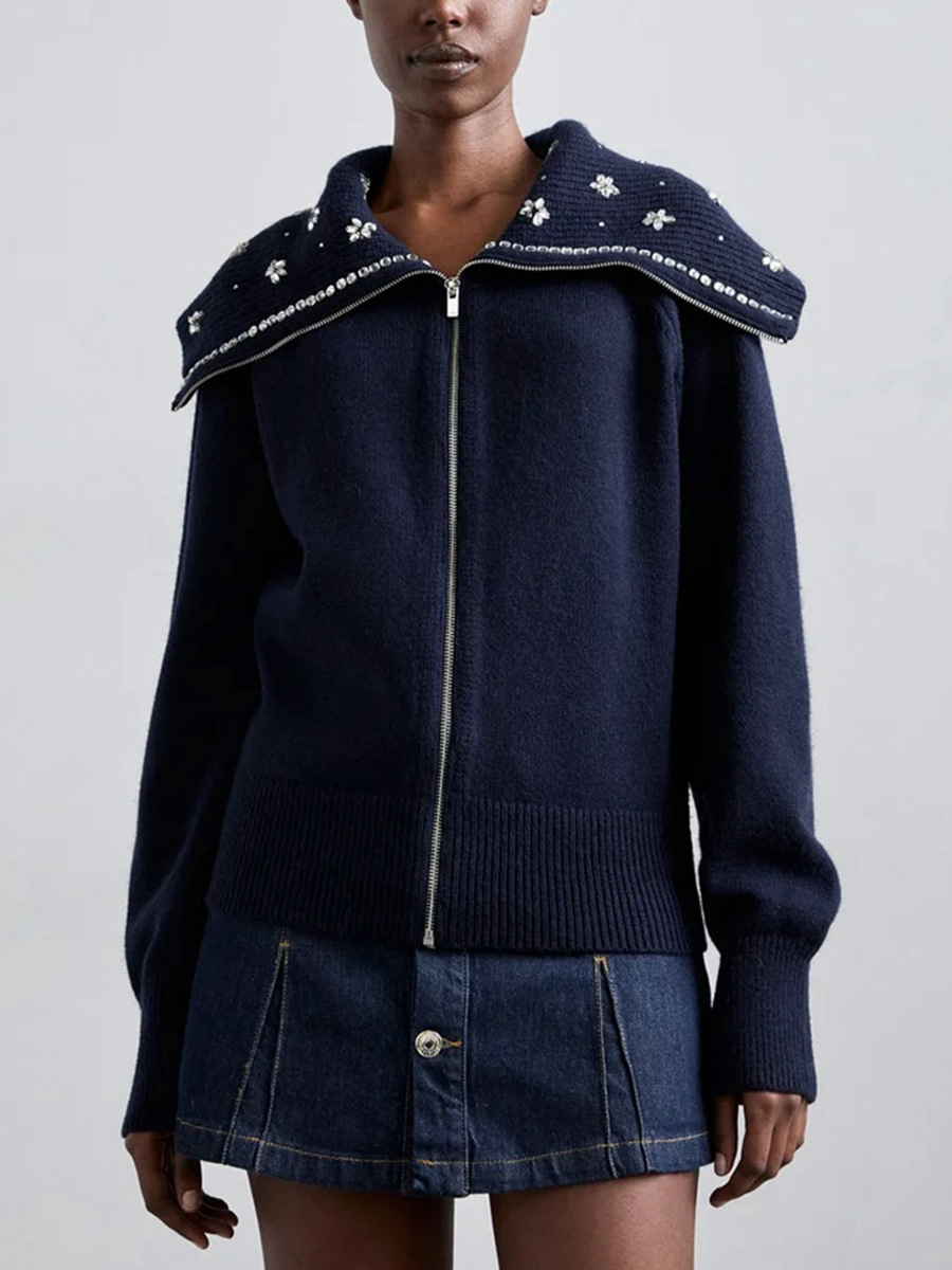 Главная страница > Женский модный свитер-кардиган в французском стиле, осень 2025, новая вышивка крючком, цветочный бисерный воротник, темно-синий