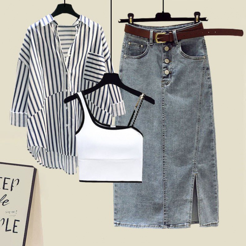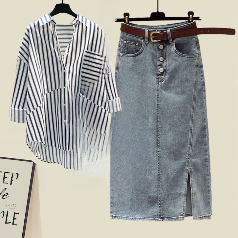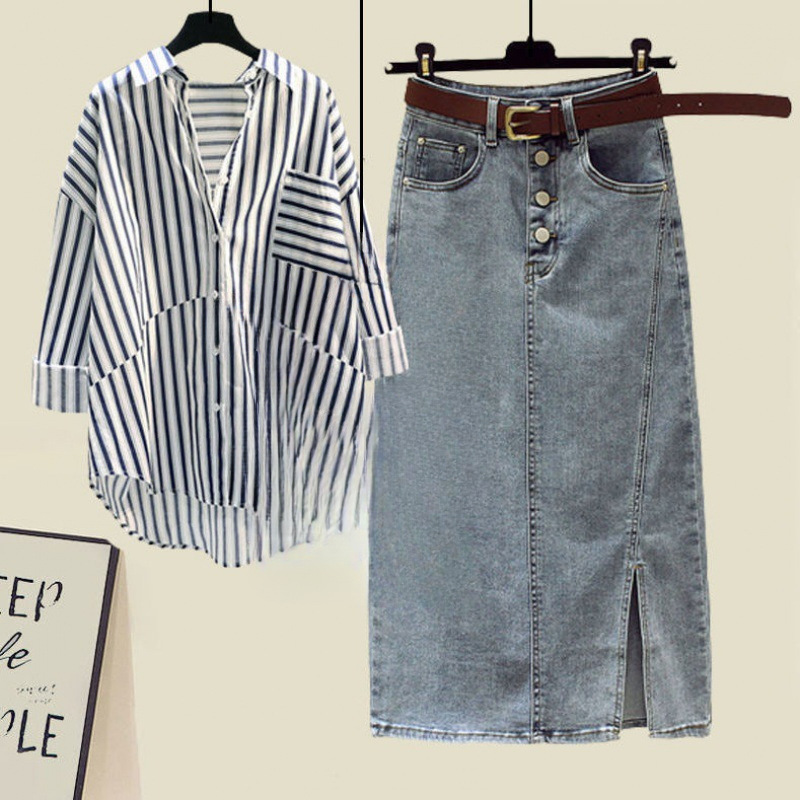 Главная страница > Летний костюм женский 2024 новый большой размер женская полосатая рубашка с подтяжкой с джинсовой юбкой из трех частей