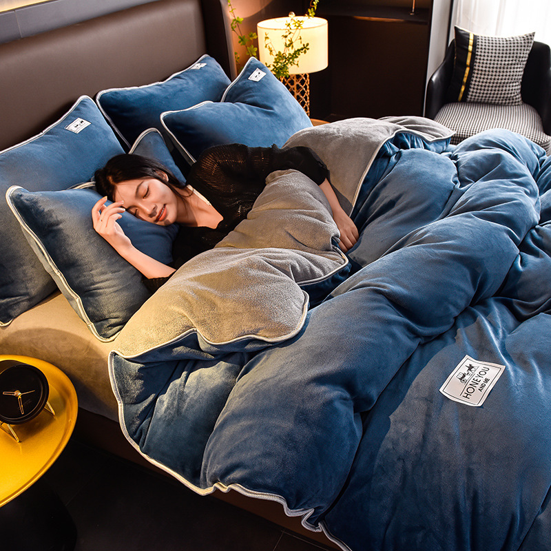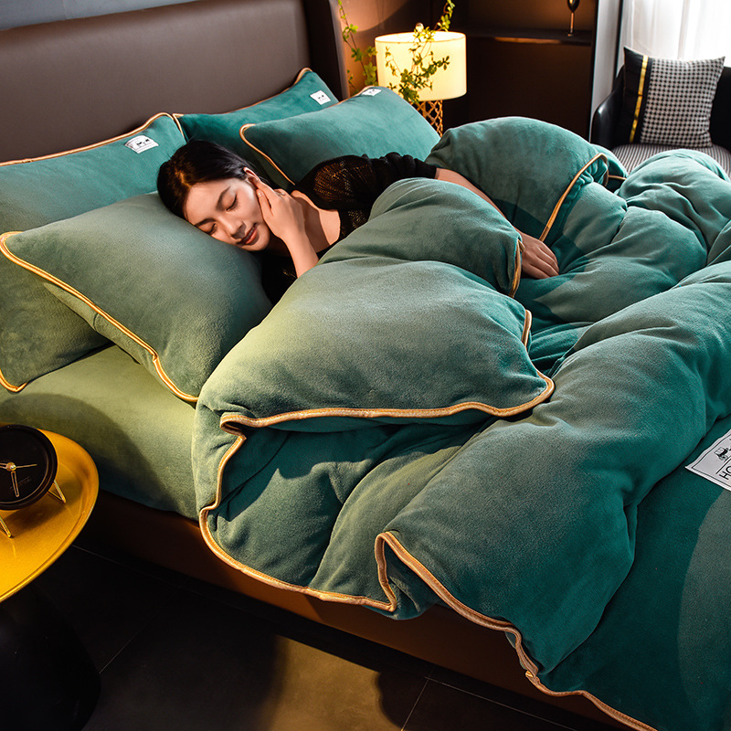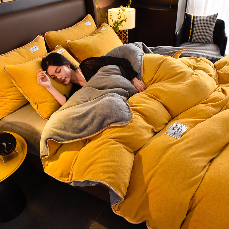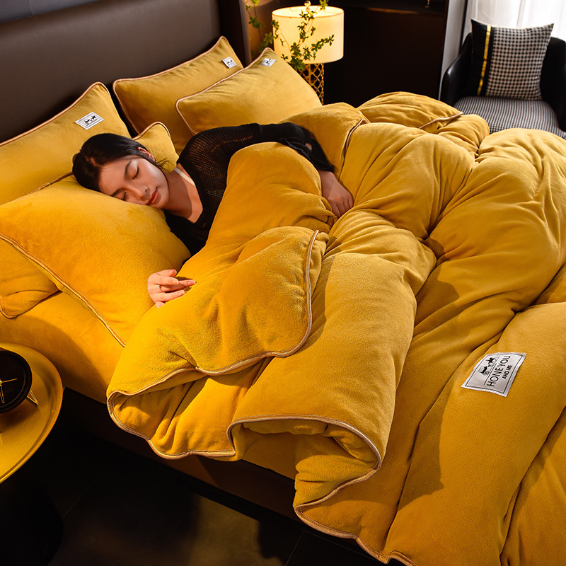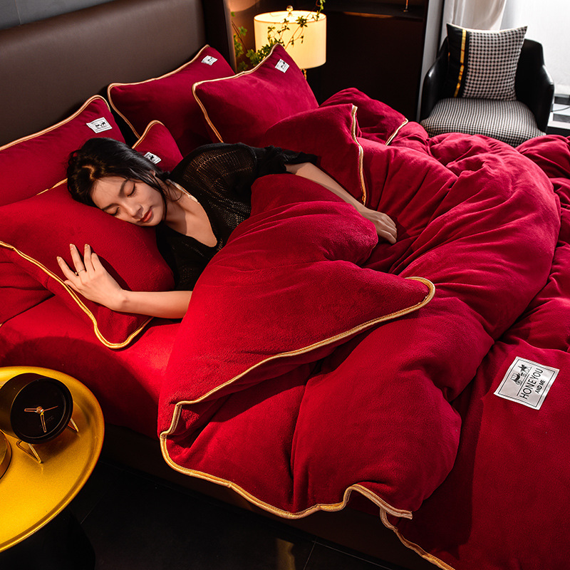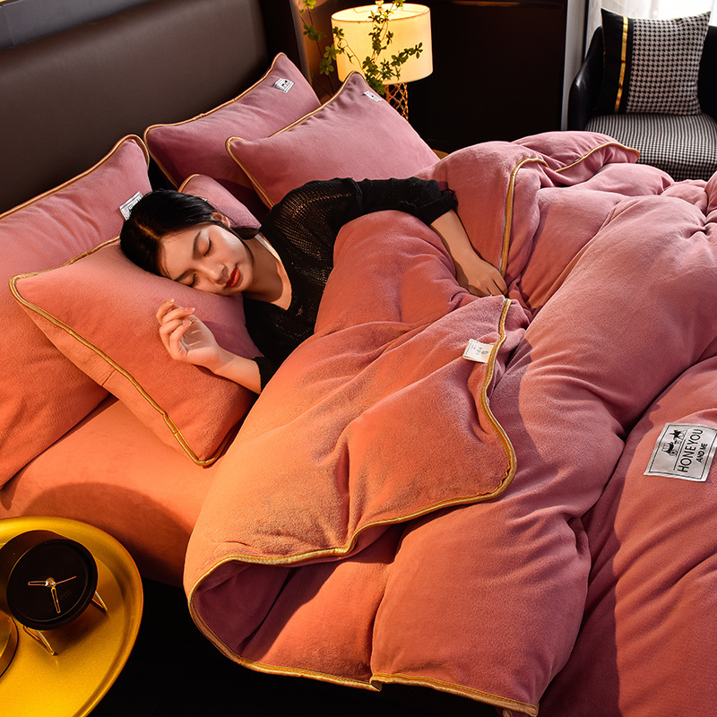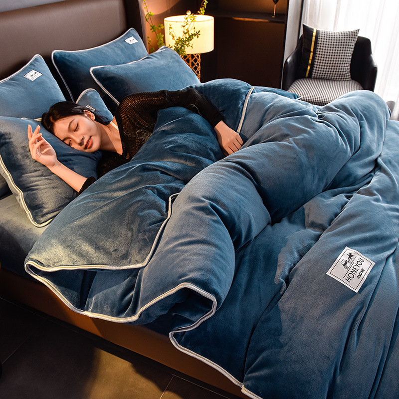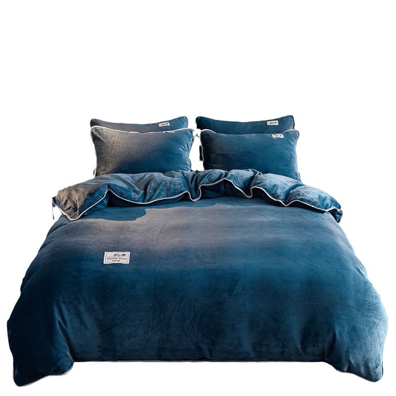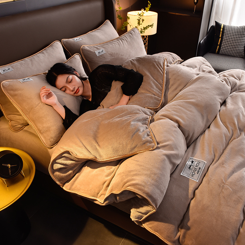 Главная страница > Новый молочный Бархатный комплект из четырех предметов, осенне-зимний однотонный утолщенный теплый фалейронг, простыня, пододеяльник, шапка, комплект из трех предметов