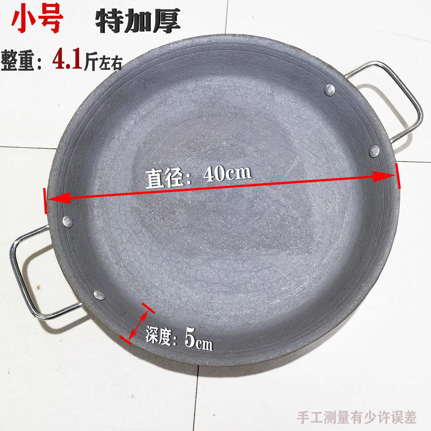 Маленький диаметр 40 см, около 2kg очень толстых чугуна с плоским дном.