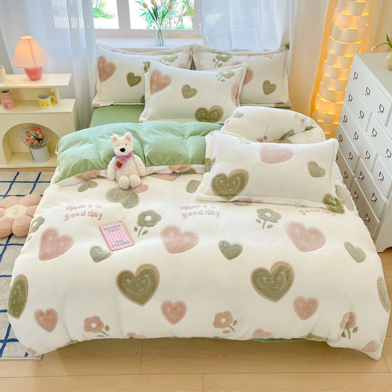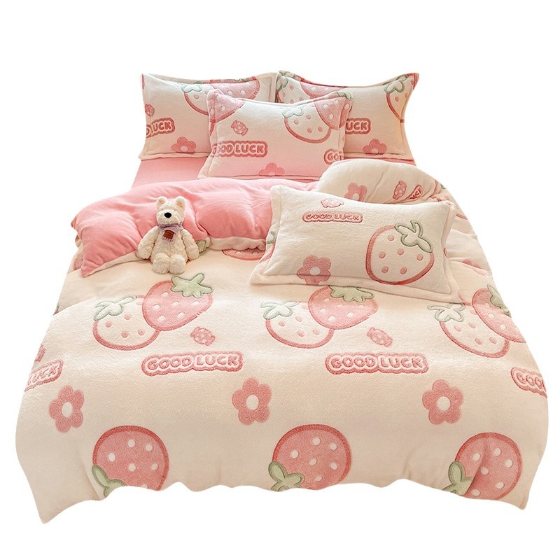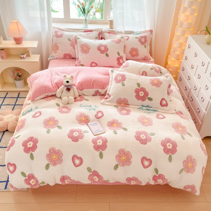 Комплект постельного белья из четырех предметов: зимний флис, велюр «снежинка», одинарный пододеяльник из молочного велюра, двусторонний флис из кораллового велюра, простыня