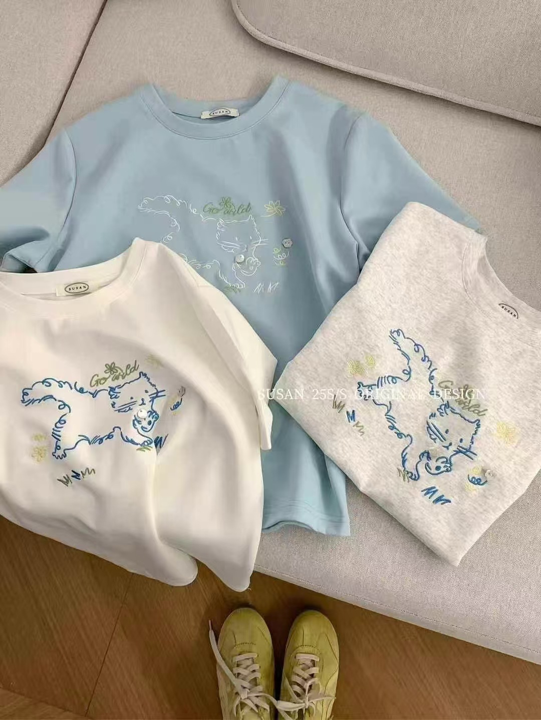 SUSAN 2025 корейский топ с вышивкой, новый пуловер с круглым вырезом и вышивкой, футболка на правое плечо с короткими рукавами для женщин, лето DL612