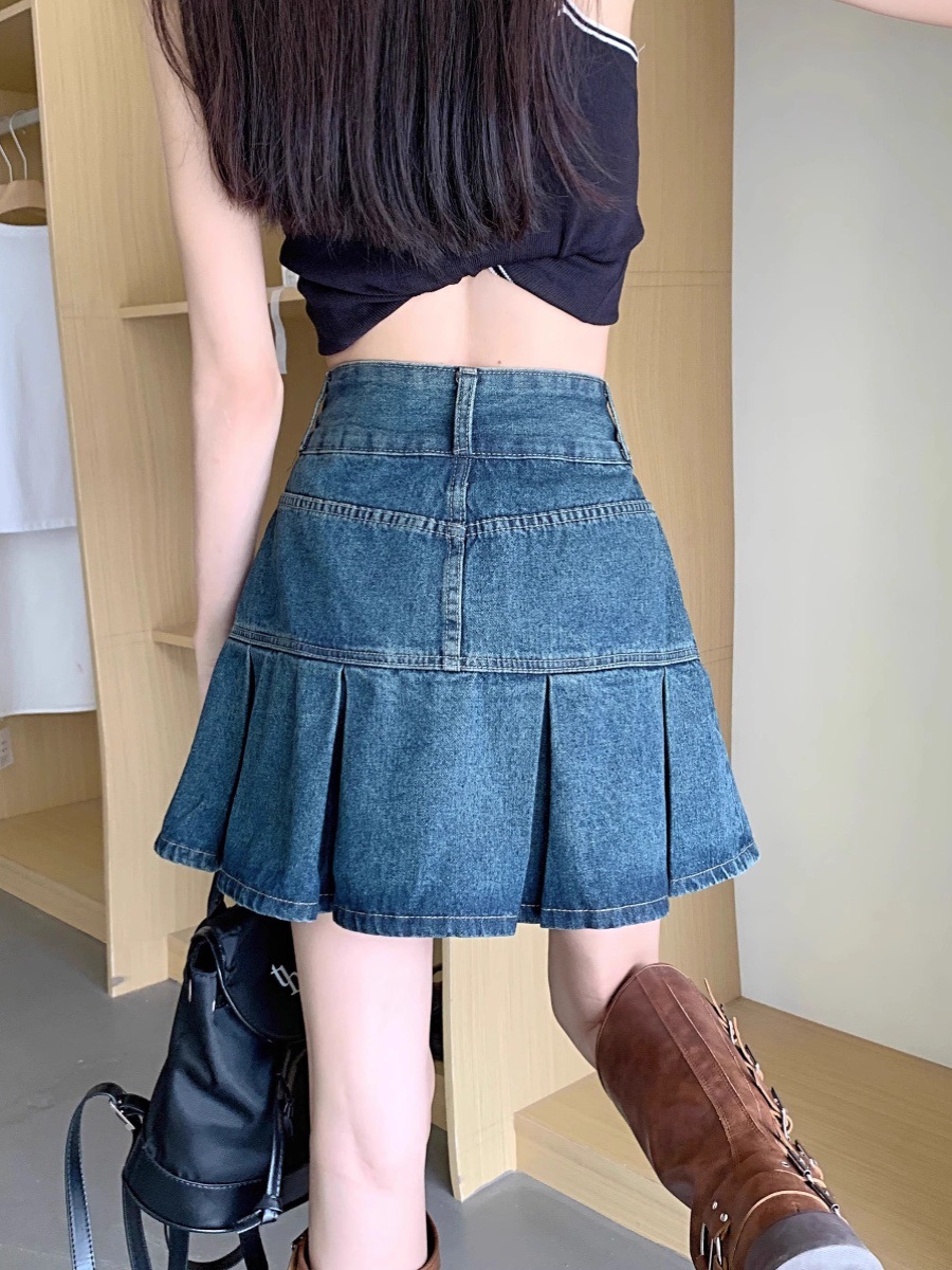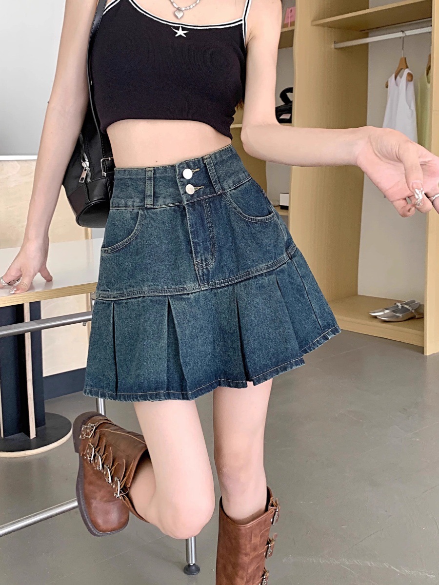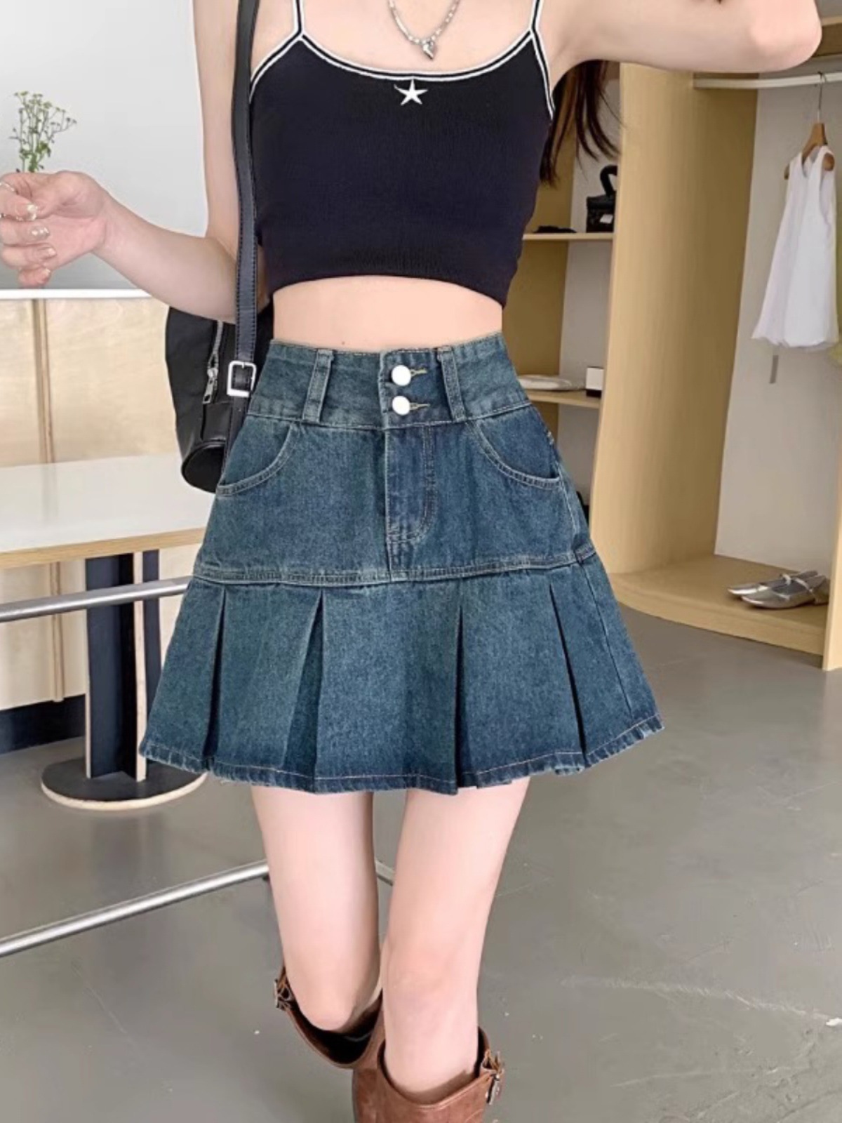 Главная страница > Черная плиссированная джинсовая юбка с высокой талией, женская осенний мм, покрывающий живот, тонкая грушевидная фигура, ретро короткая юбка