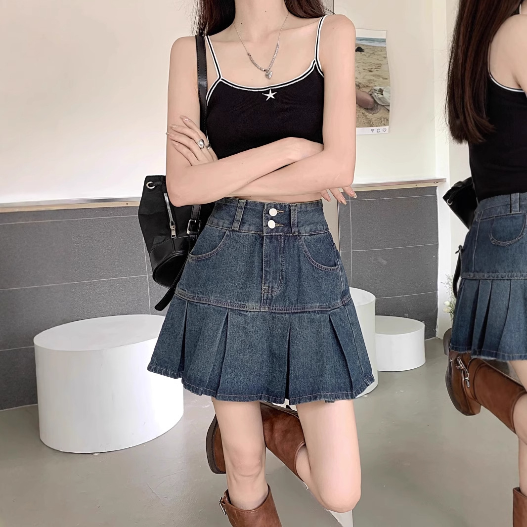 Черная плиссированная джинсовая юбка с высокой талией, женская осенний мм, покрывающий живот, тонкая грушевидная фигура, ретро короткая юбка