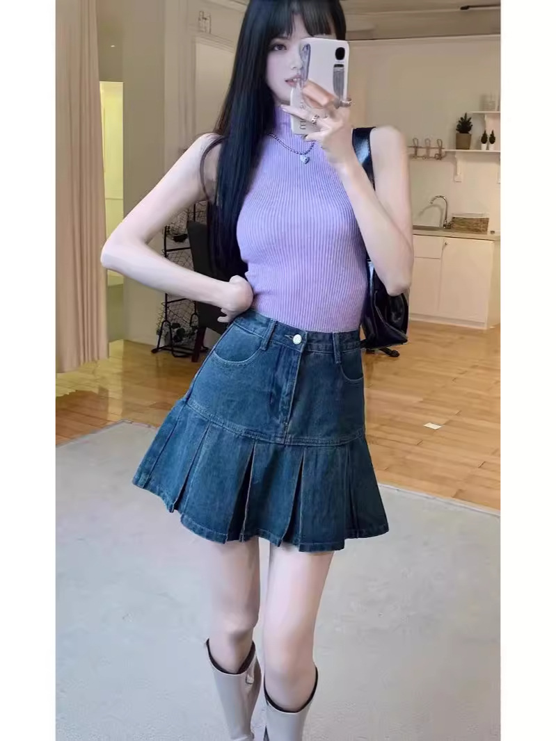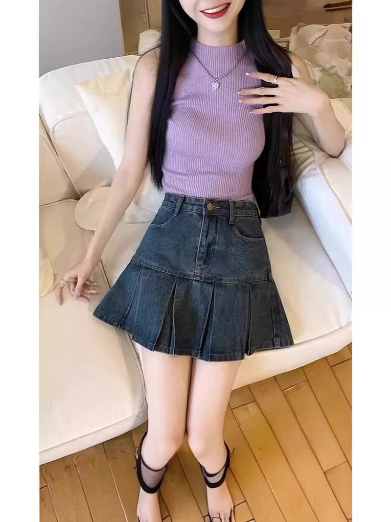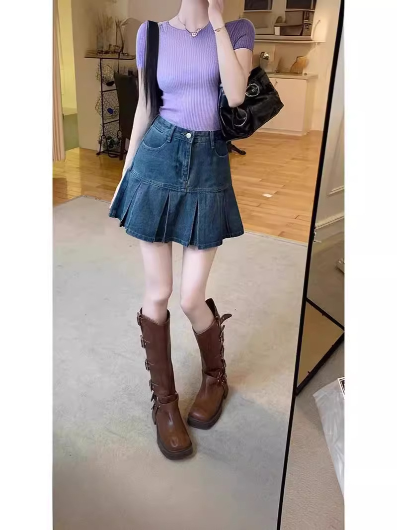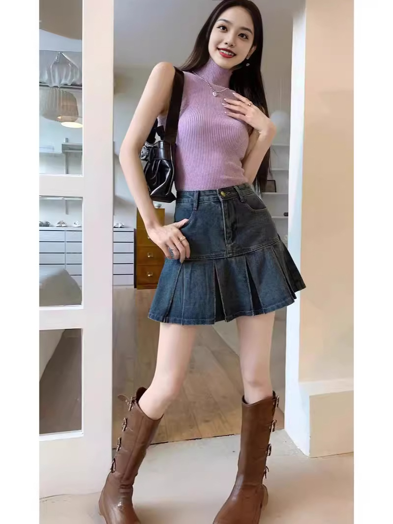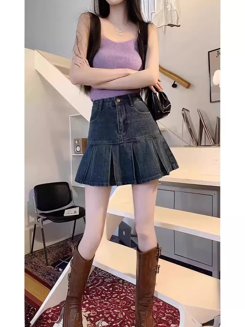 Главная страница > Ретро плиссированная джинсовая юбка с высокой талией женский летний новый живот тонкий дизайн
