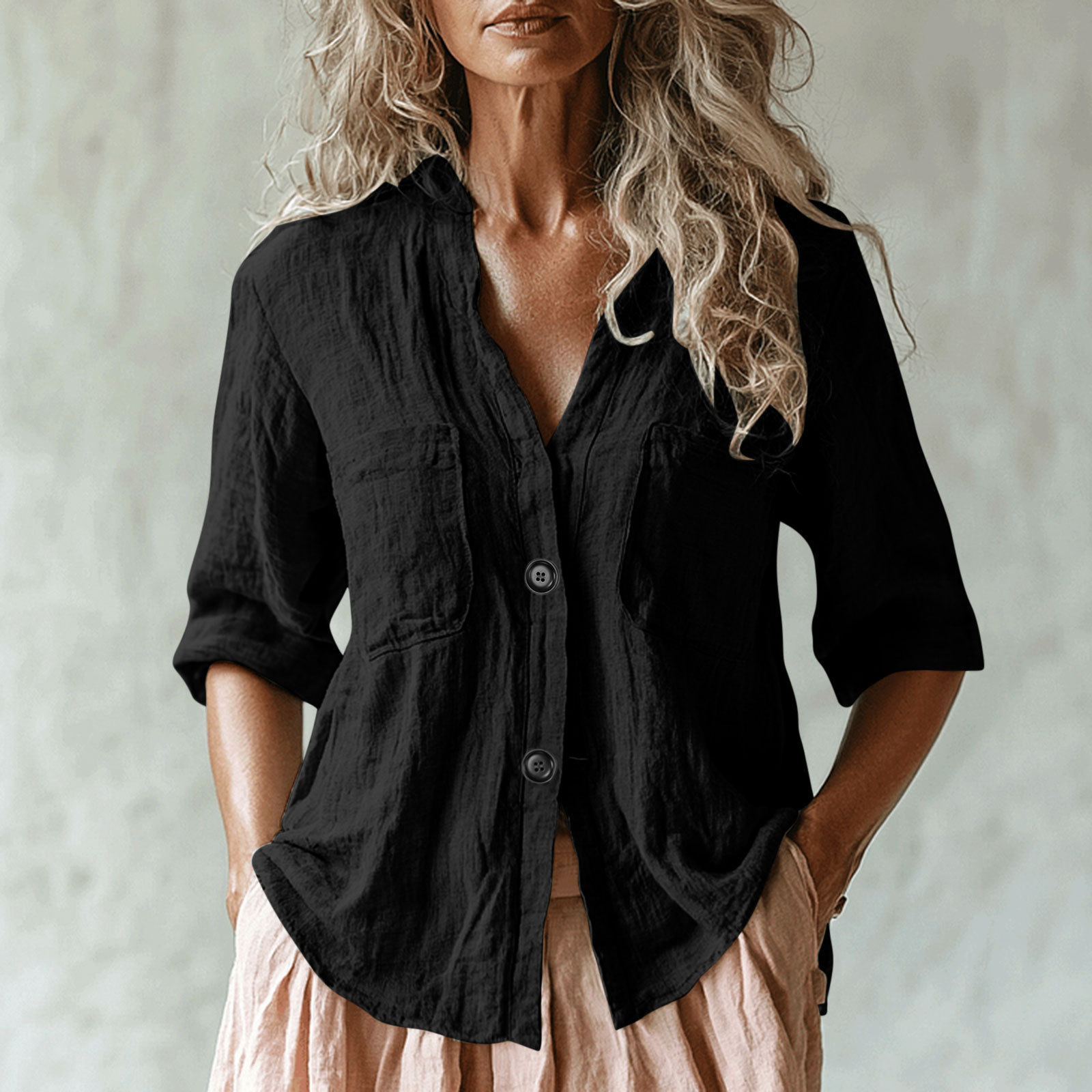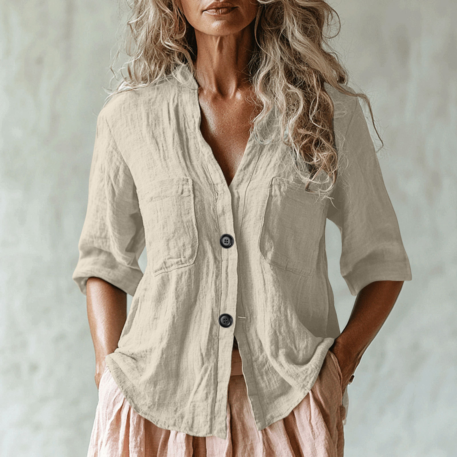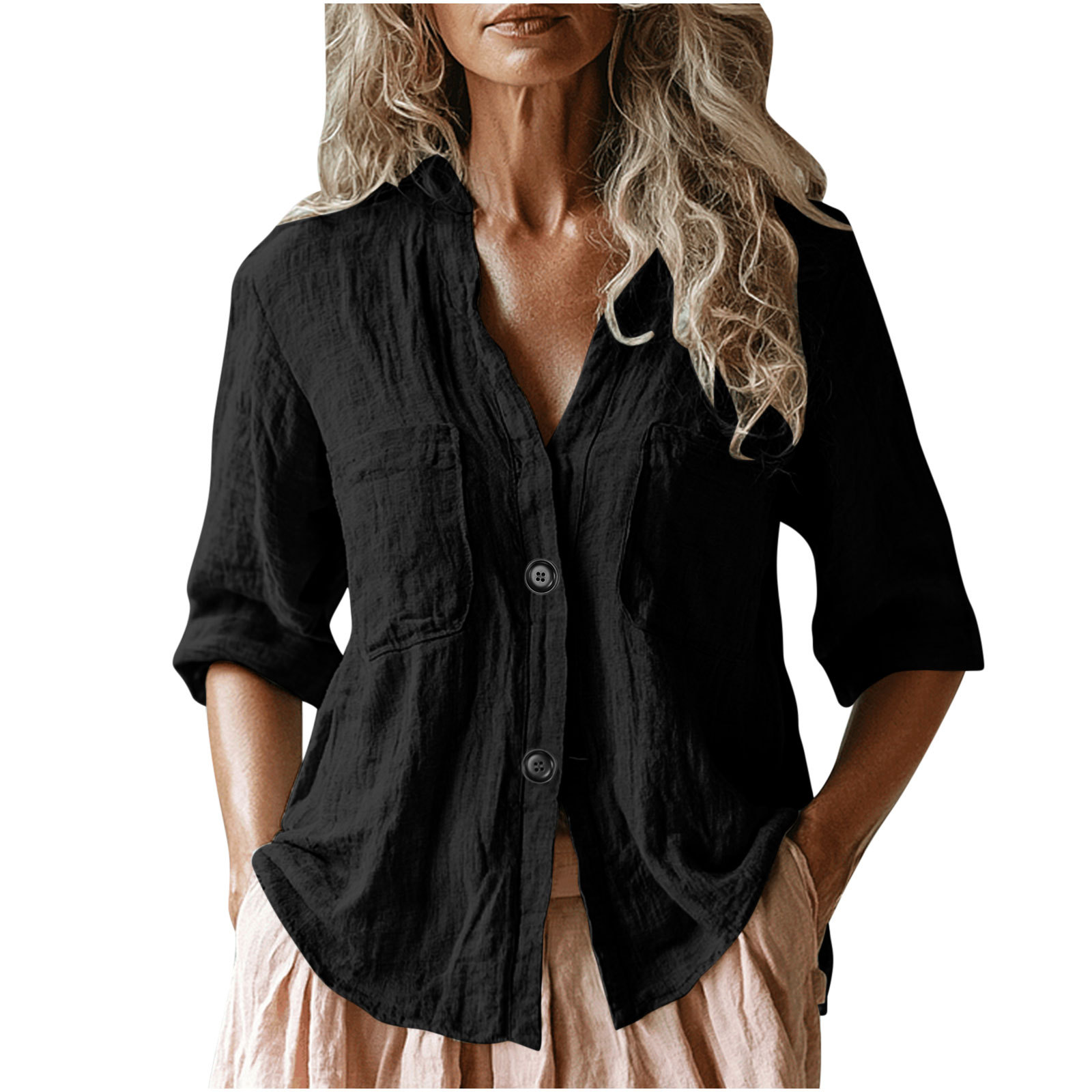 Главная страница > Новая летняя европейская и американская трансграничная женская однотонная льняная рубашка с несколькими карманами и рукавами три четверти, повседневная свободная рубашка