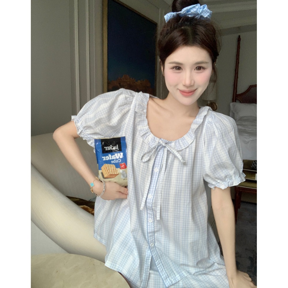 Корейская пижама женская синяя клетка маленькая свежая 2024 сетка красная кукольный воротник домашняя одежда ins премиум-чувский набор
