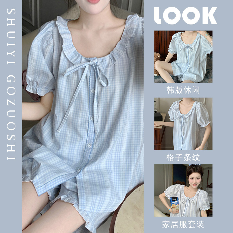 Главная страница > Корейская пижама женская синяя клетка маленькая свежая 2024 сетка красная кукольный воротник домашняя одежда ins премиум-чувский набор