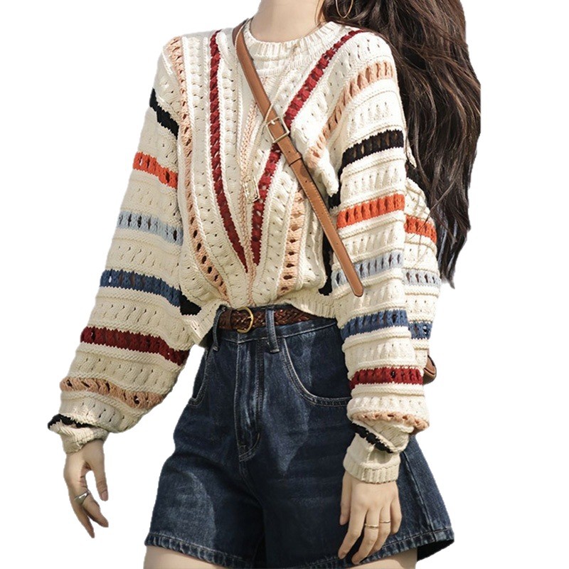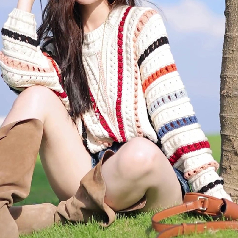 2024 премиум чувство ретро топ чайный чай шикарный радужный полосатый свитер с круглым вырезом свитер женский