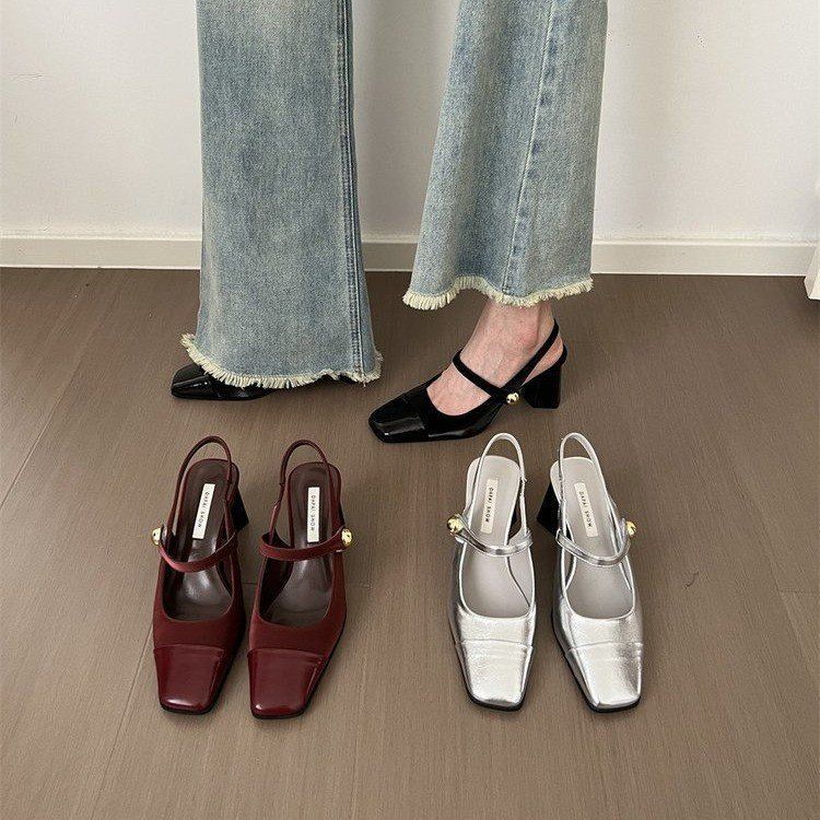 Женские босоножки на высоком каблуке, с толстым каблуком и квадратным носком, с вырезом сзади, больших размеров, из мягкой натуральной кожи, весна 2025 года.