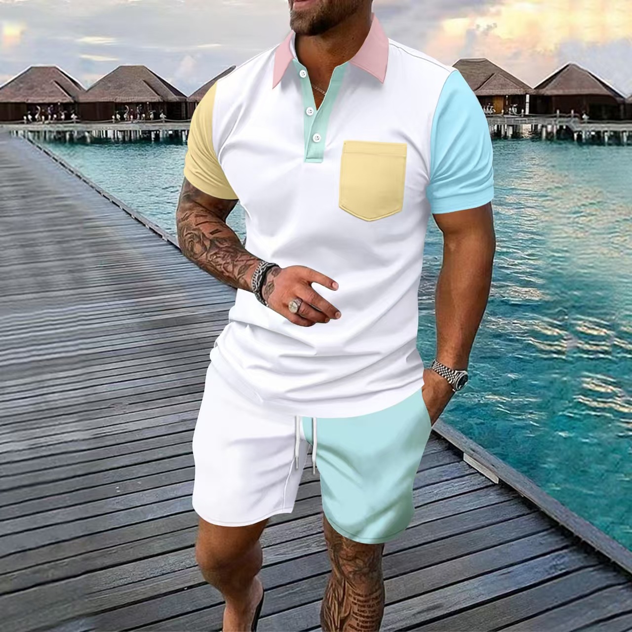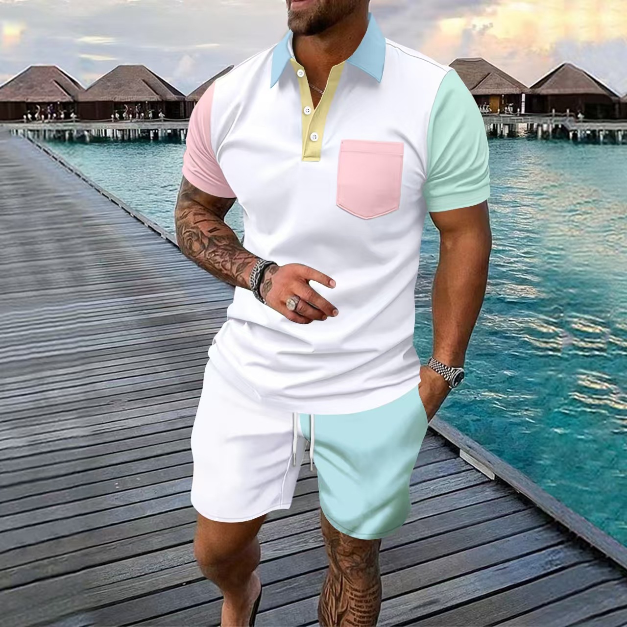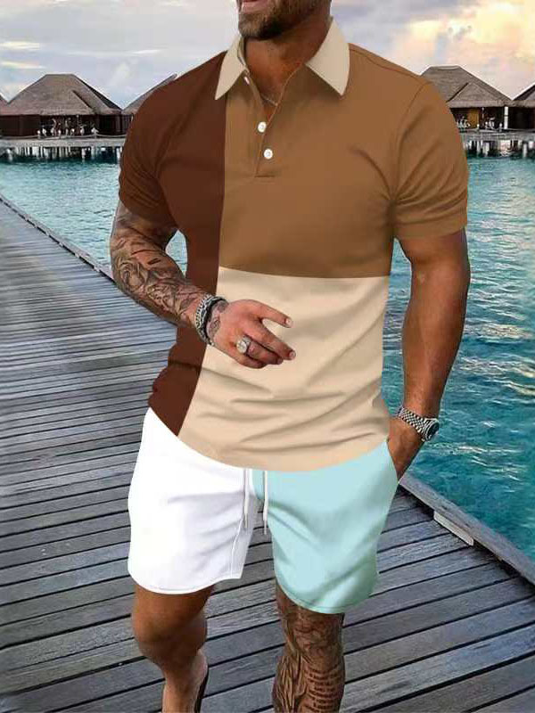 Главная страница > Amazon Европейский и американский трансграничный мужской костюм 3D контрастного цвета, свежая мужская повседневная рубашка-поло с короткими рукавами, шорты, комплект из 2 предметов
