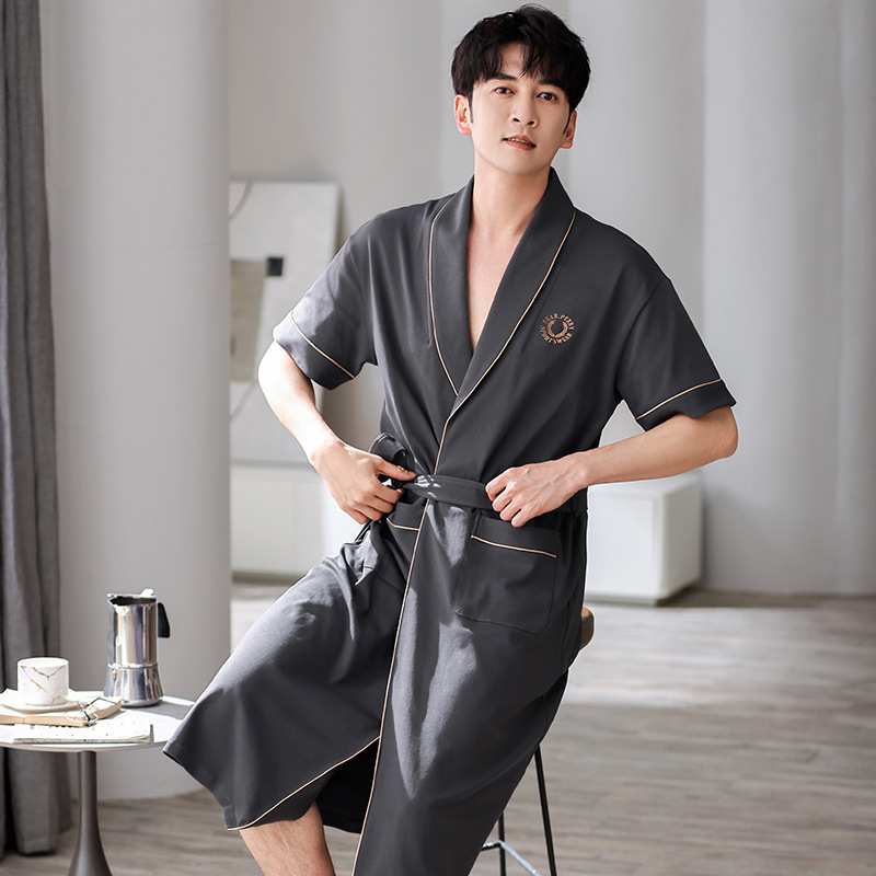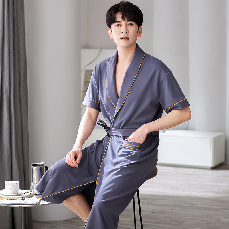 Главная страница > Летние хлопчатобумажные свободные халаты Мужская цельная ночная юбка большого размера свободная версия средней длинности кардиган халат домашняя одежда