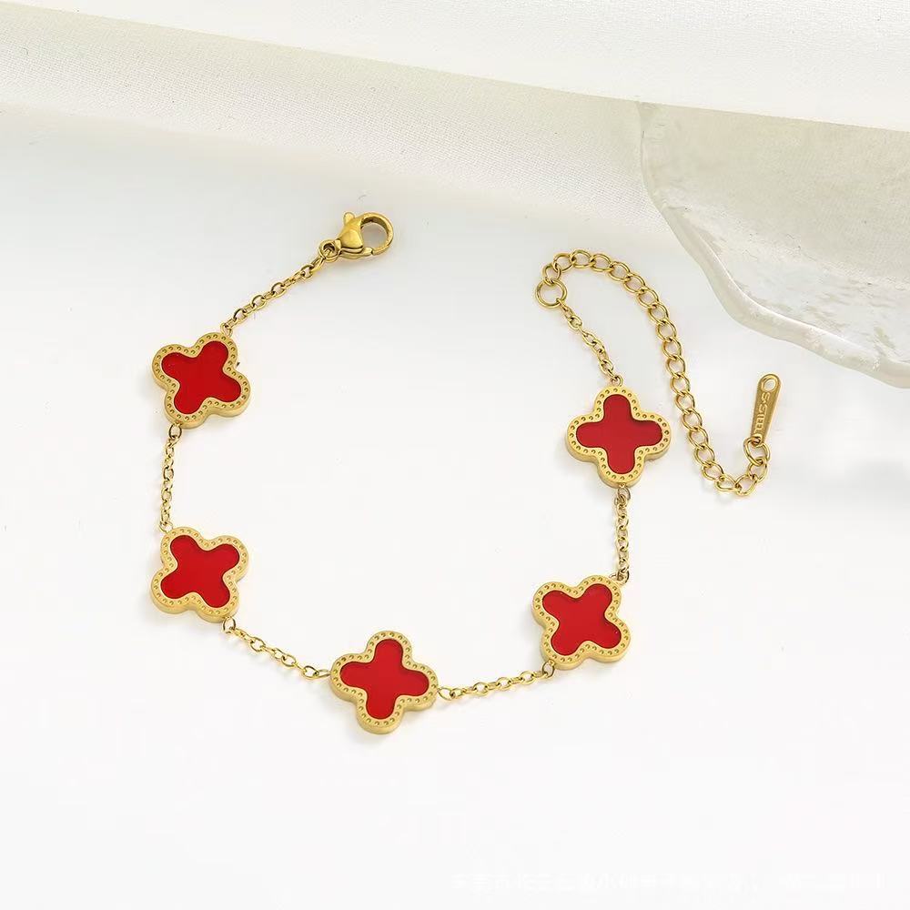 Новый европейско-американский браслет из титановой стали с двусторонним изображением четырехлистного клевера, не тускнеющий, простой и универсальный, с пятью цветами из перламутра, на удачу, новая модель 2024 года.