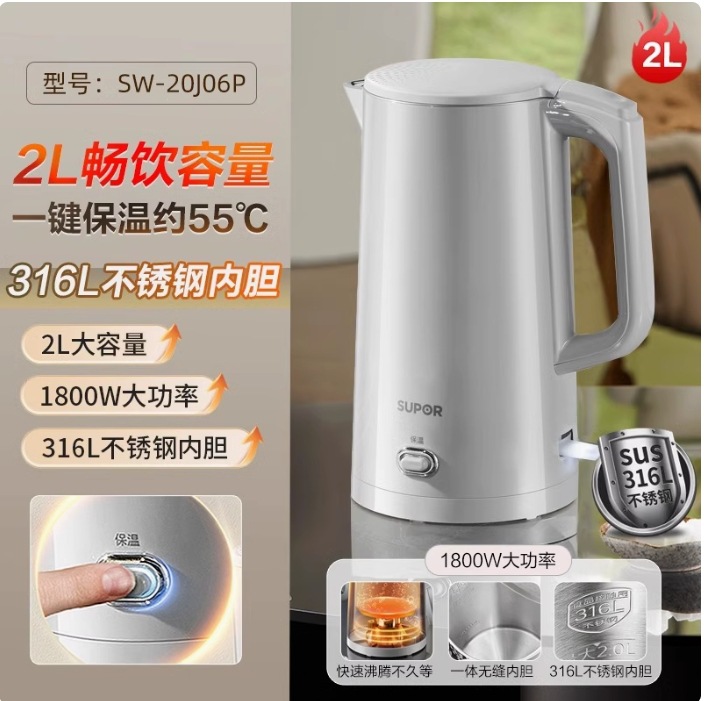 Supor Электрический чайник 2L Бытовой чайник для матери и ребенка класса 316L нержавеющая сталь 1800W Быстродермический двухслойный SW-20J07A