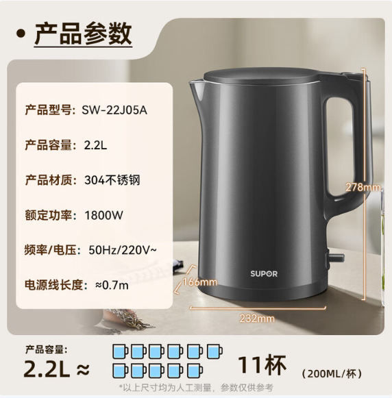 Главная страница > Supor Электрический чайник 2L Бытовой чайник для матери и ребенка класса 316L нержавеющая сталь 1800W Быстродермический двухслойный SW-20J07A