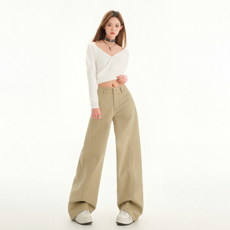 SY7609 новый американский ретро джинсы женский дизайн чувство сшивания цвета хаки свободные широкие ноги прямые брюки