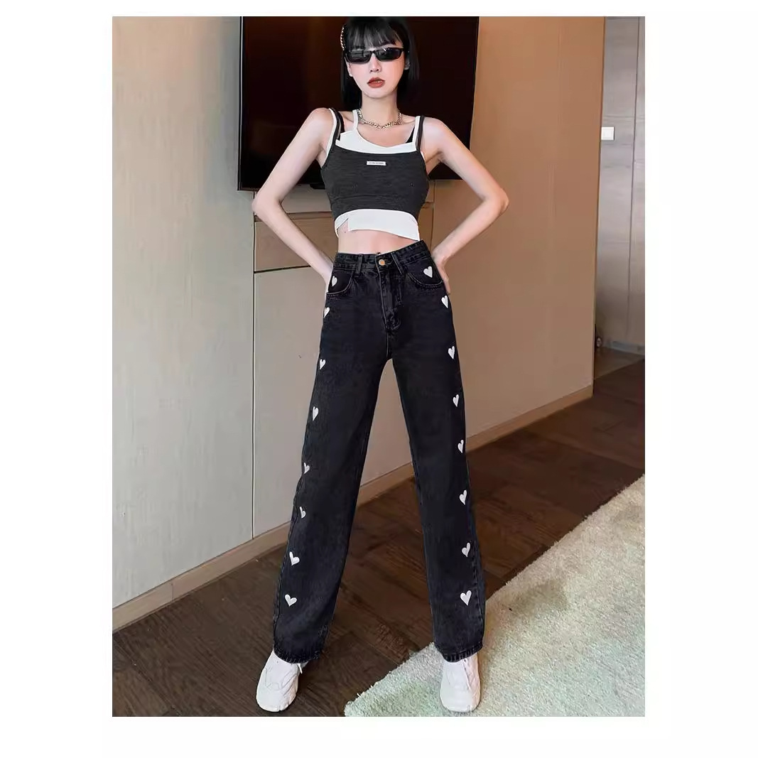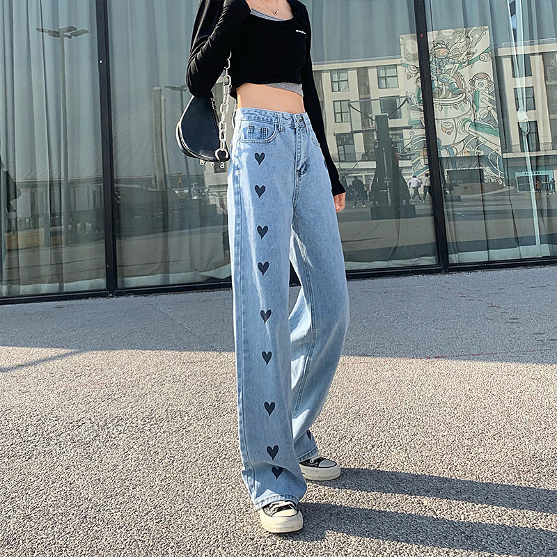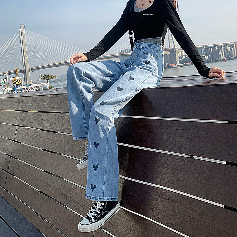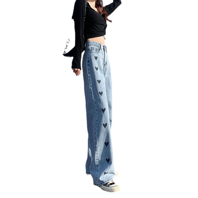 Главная страница > Широкие джинсы с драпировкой и вышивкой в виде сердца для студенток, весенне-осенние прямые брюки в корейском стиле большого размера с высокой талией и длиной до пола для женщин
