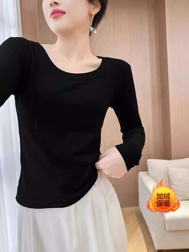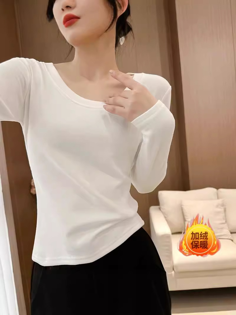 U-образный воротник с плюшевым плечом, толстая футболка с длинными рукавами, женская футболка осень-зима