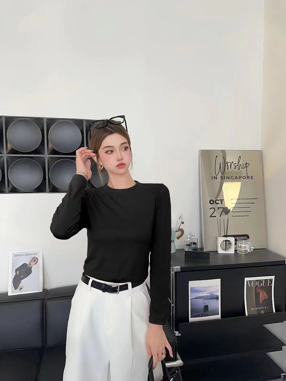 Модальный высокоэластичный круглый вырез с длинным рукавом белого цвета