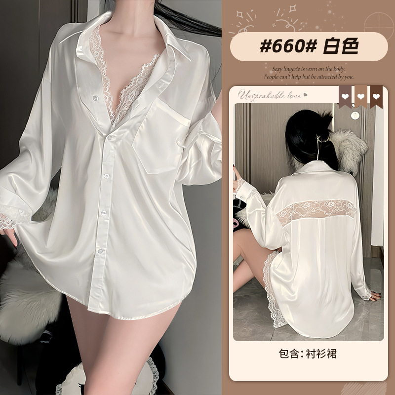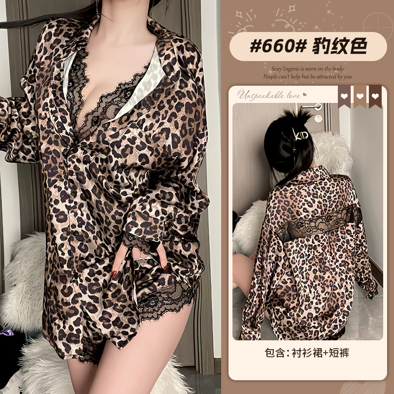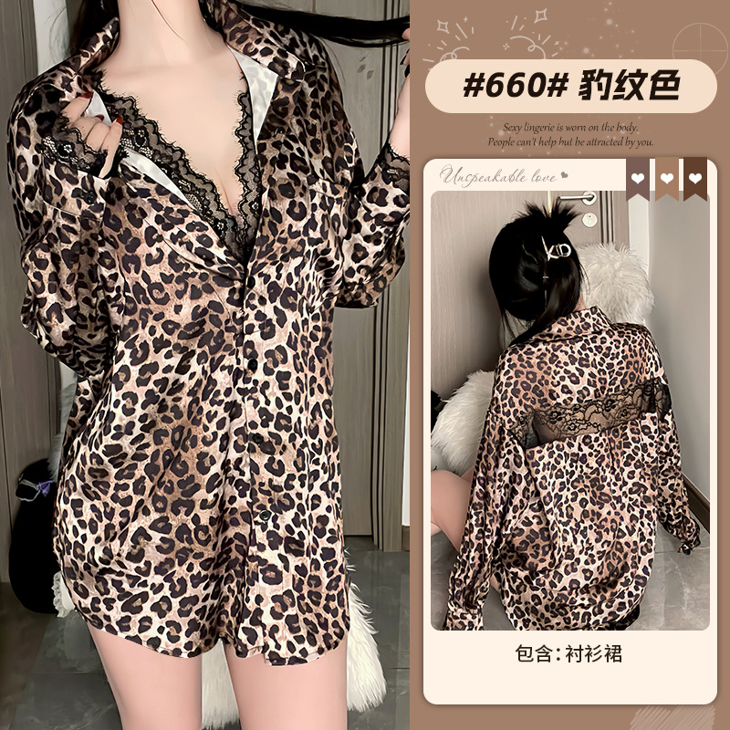Комплект домашней одежды Xianyi: сексуальная рубашка с глубоким V-образным вырезом и длинными рукавами, в стиле «чистое желание», с кружевом и леопардовым принтом, можно носить и на выход, 660