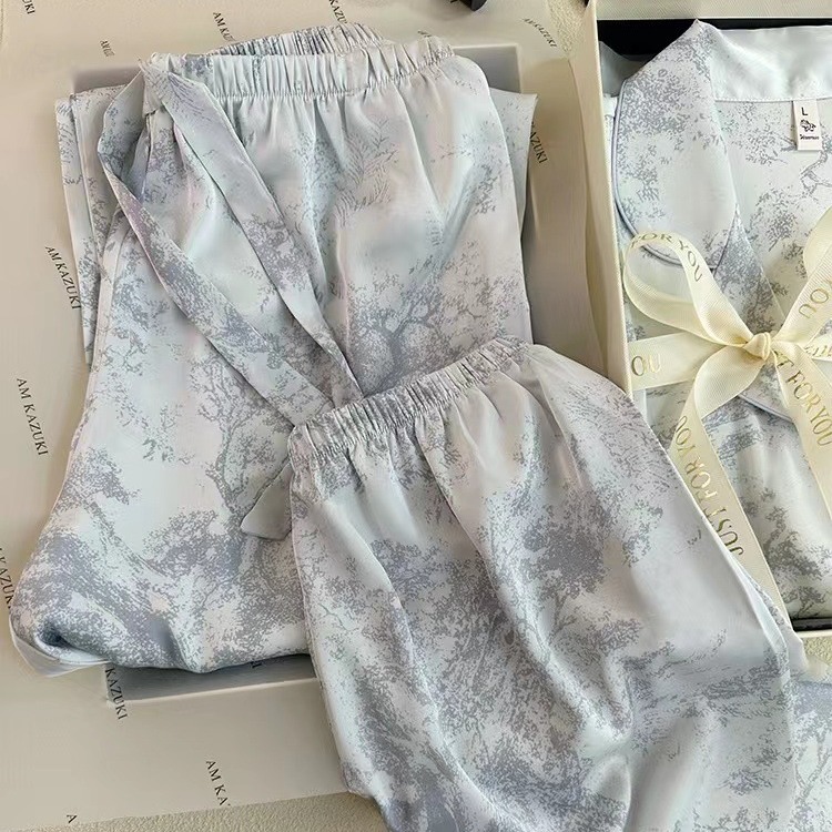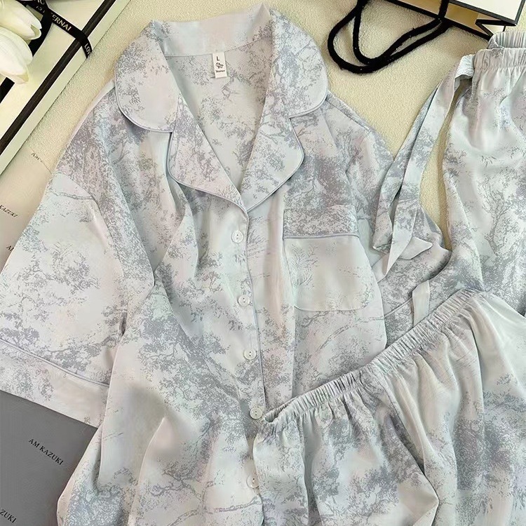 Главная страница > Новый стиль пижамы из ледяного шелка для женщин, летний комплект из трех предметов с короткими рукавами в стиле художественной живописи, высококачественная легкая роскошная домашняя одежда, которую можно носить и на выход.