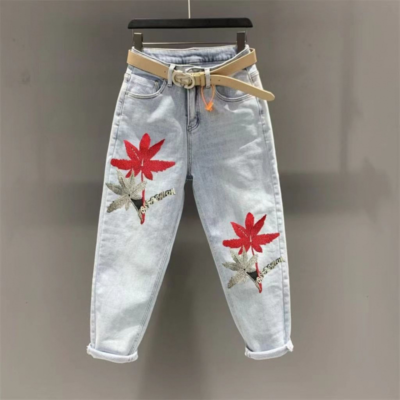 Главная страница > [Коллекция на 2151 человека] Джинсовые женские шаровары больших размеров с вышивкой кленового листа, лето 2025, универсальный и стройнящий вид