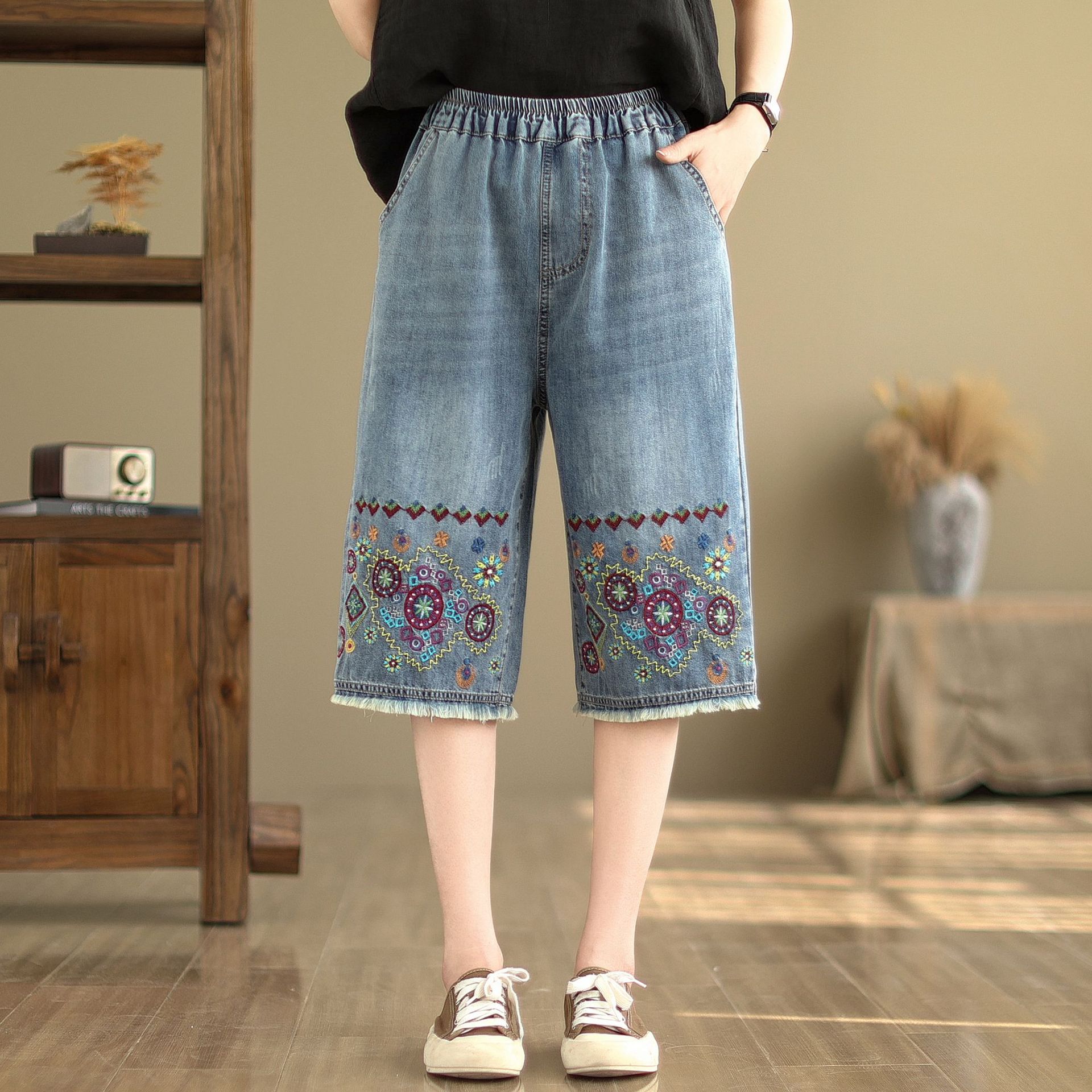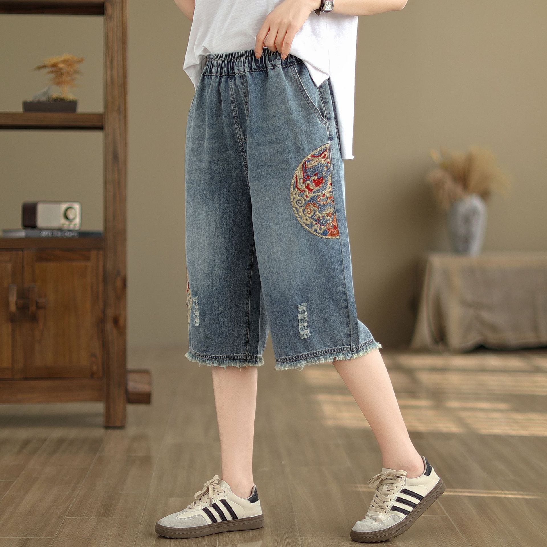 Корейская вышивка тонкая с высокой талией джинсовые брюки женские укороченные брюки летняя тонкая шорта прямые трусы прохладный повседневный 5-укороченные брюки