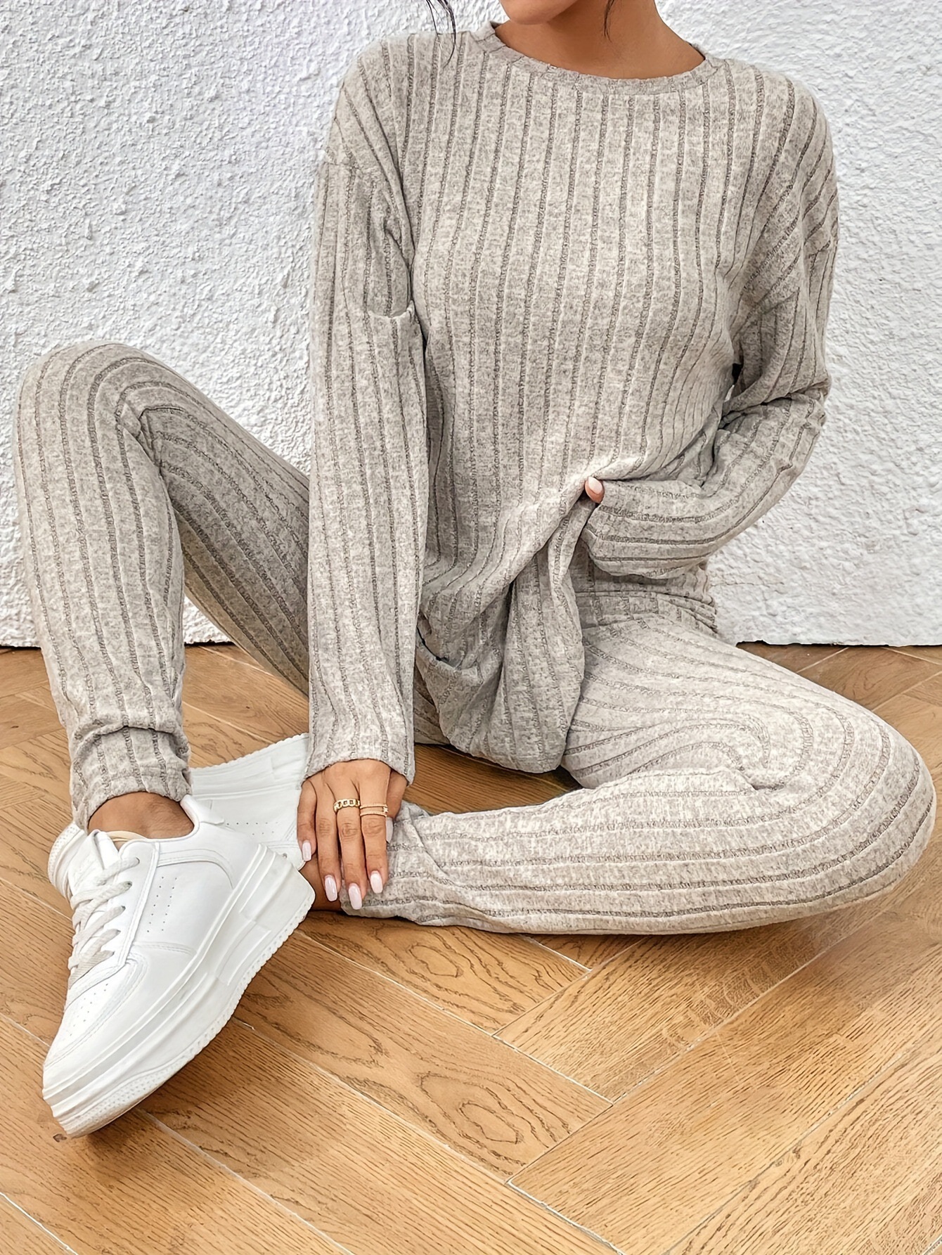 Главная страница > Европейский и американский трансграничный женский костюм, вязаный костюм в полоску с длинными рукавами и круглым вырезом, повседневные модные брюки для прогулок, модный комплект из двух предметов