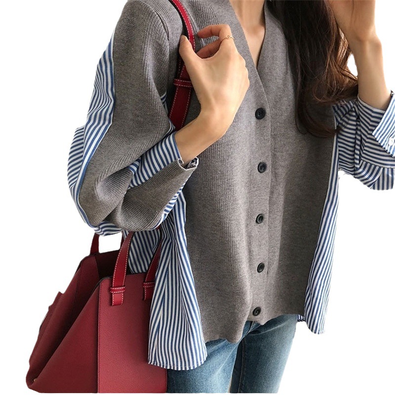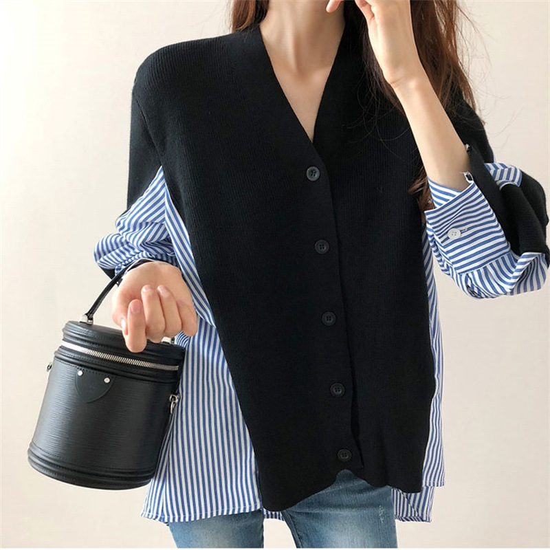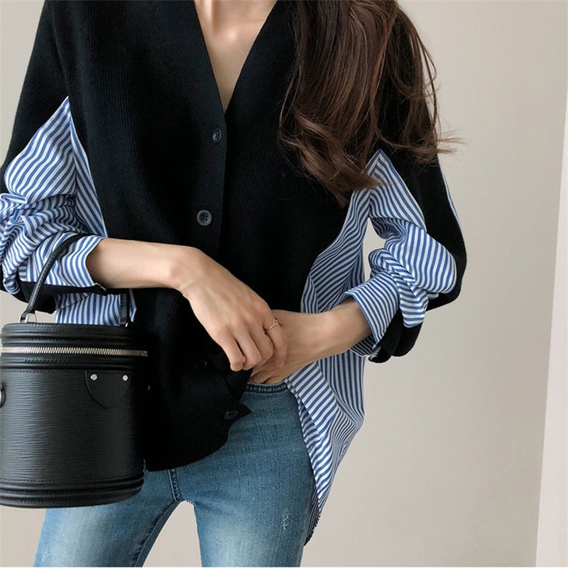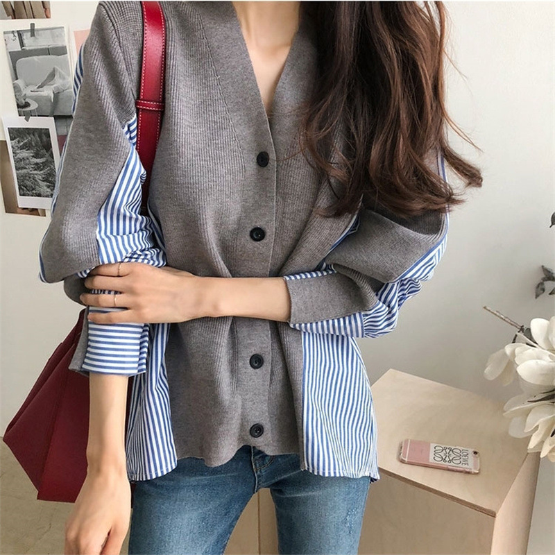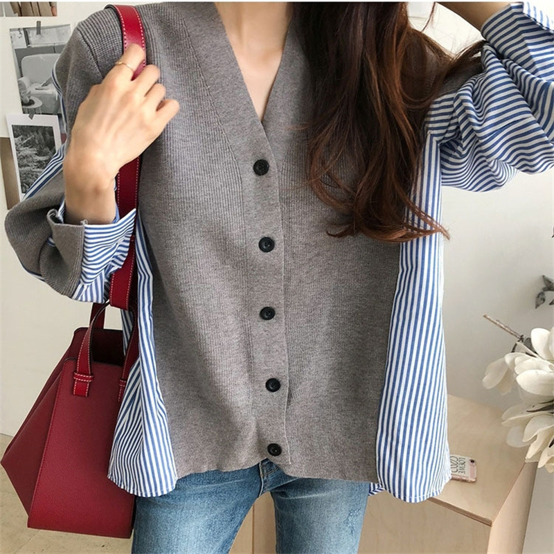 Главная страница > Женская одежда в Корейском стиле, новая рубашка контрастного цвета в полоску контрастного цвета, Свободный вязаный кардиган, свитер, пальто средней длины, женский