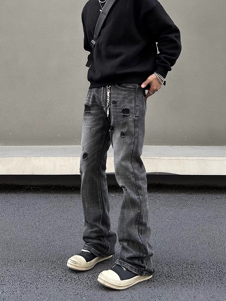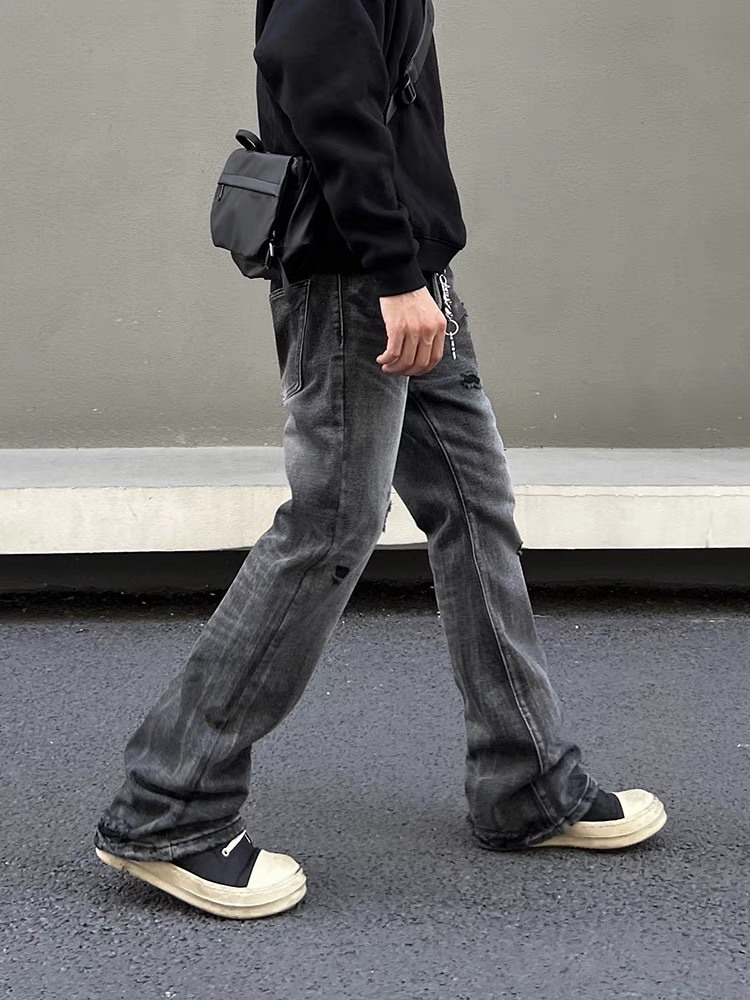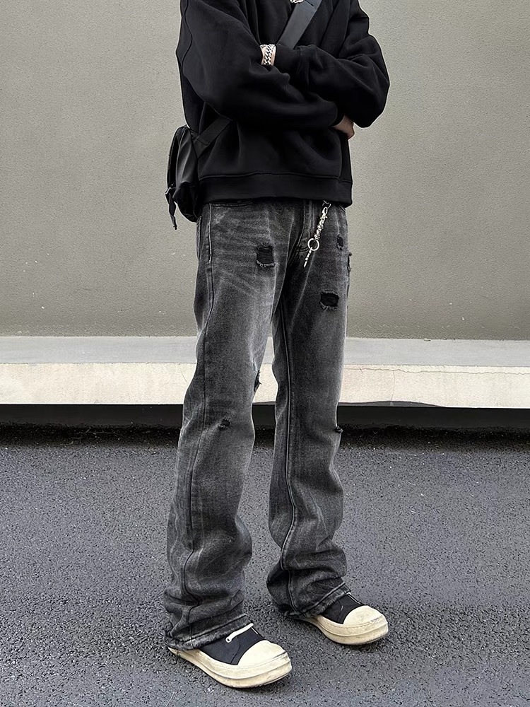 Главная страница > Выбеленные черные рваные джинсы, мужские прямые узкие брюки для чистки в стиле American High Street Vibe