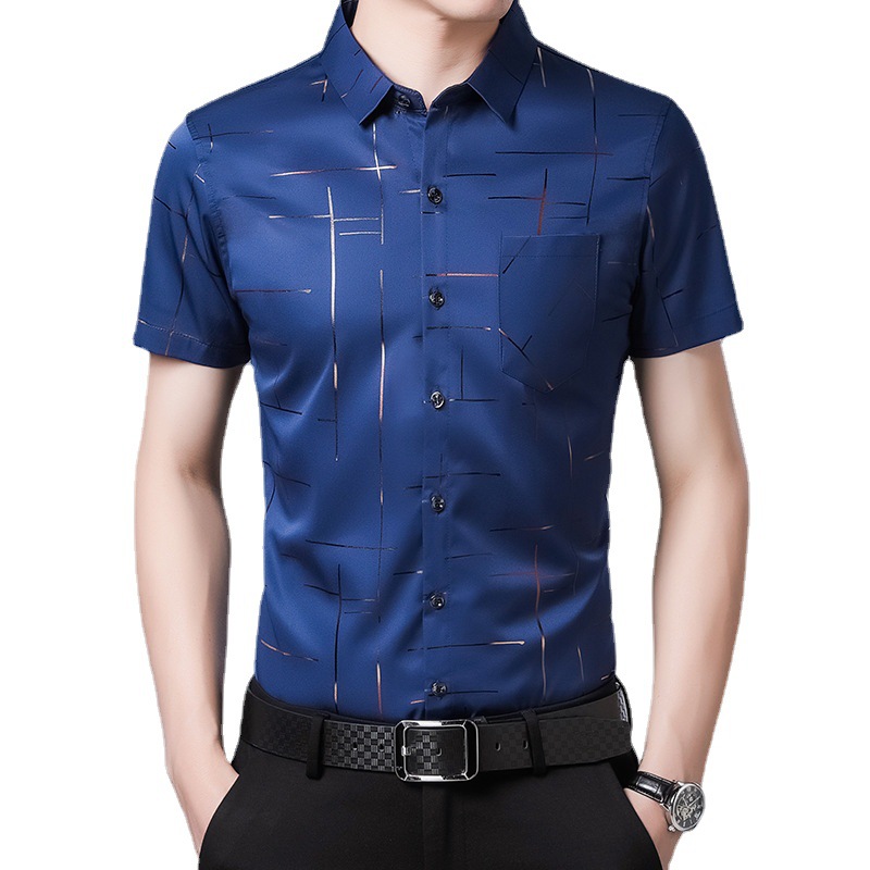 Главная страница > Мужская рубашка с коротким рукавом 2025 года для мужчин среднего возраста, из ледяного шелка, немнущаяся, с полосатым воротником, повседневная летняя одежда, тонкая и универсальная.