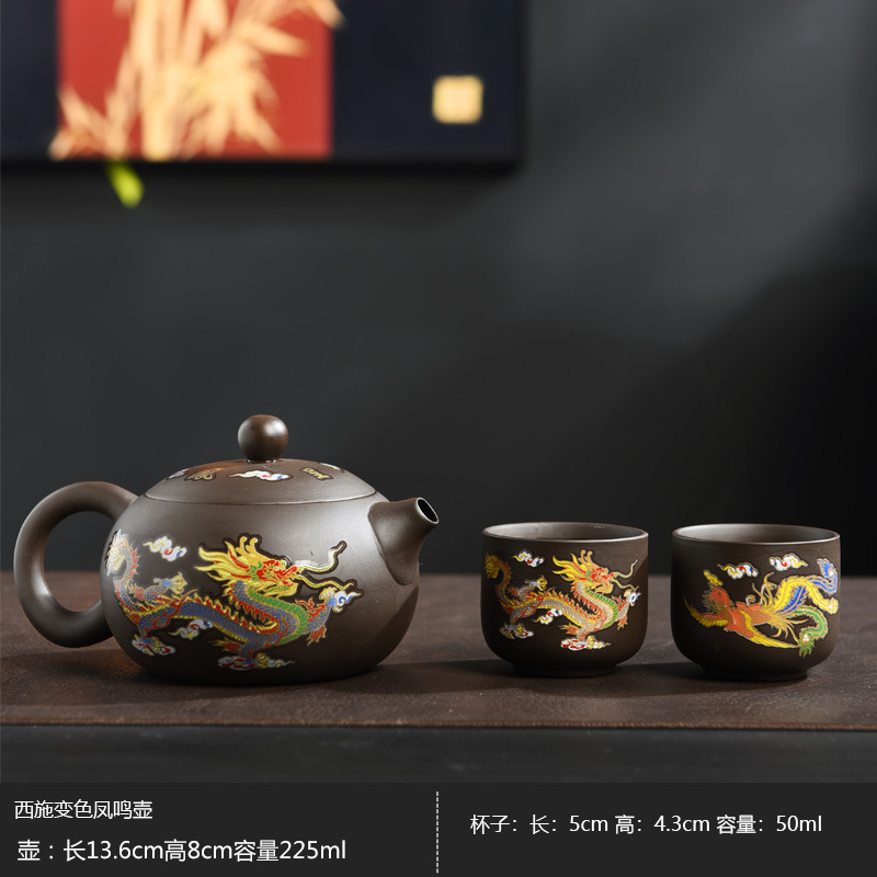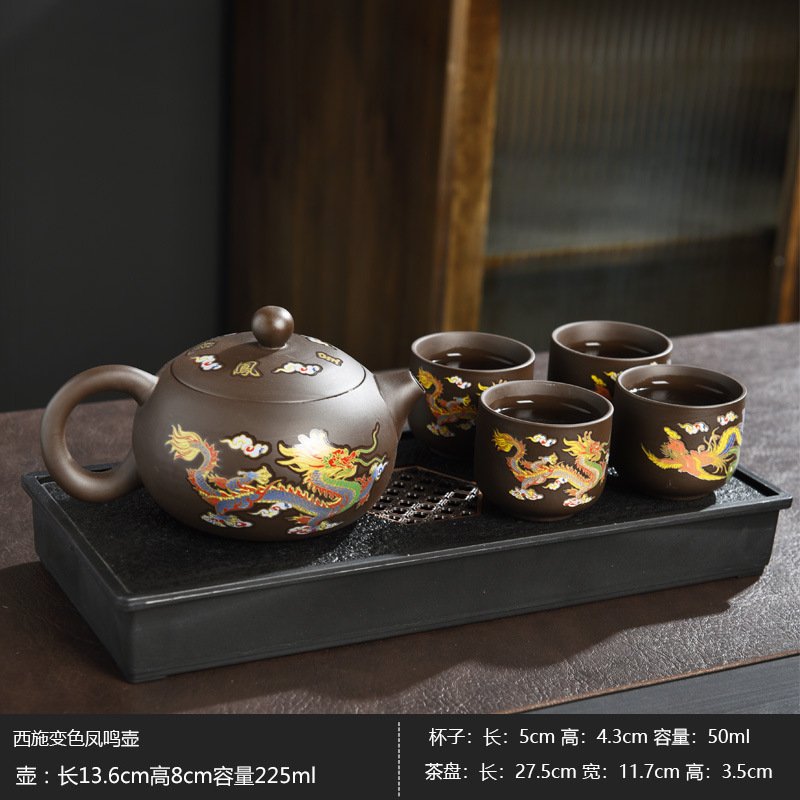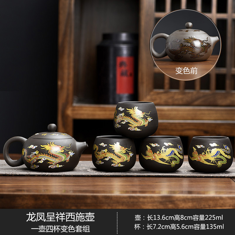 Фиолетовый песочный горшок Fengming Dragon and Phoenix, меняющий цвет, — черный горшок с четырьмя чашками (подарочная коробка)