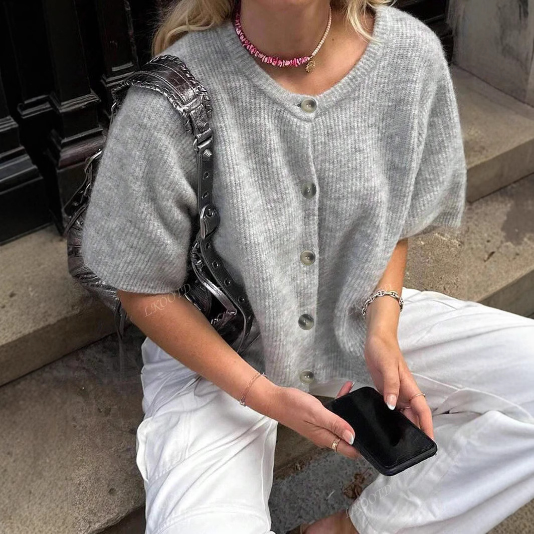 Женский короткий кардиган европейского стиля, однотонный, с полуоткрытым воротником и пуговицами.