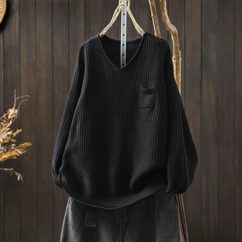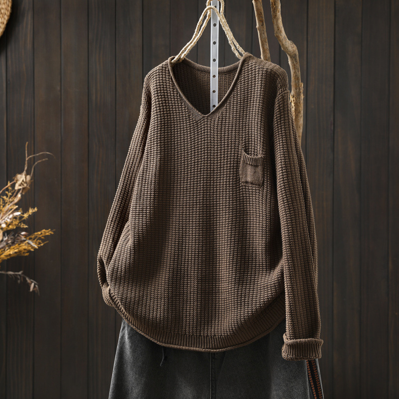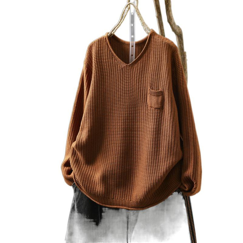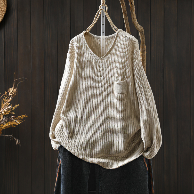Главная страница > Женский трикотажный костюм 2025 года: осенние брюки с небольшими карманами-клапанами, свободный хлопковый трикотажный низ, вязаный пуловер с V-образным вырезом и длинными рукавами.