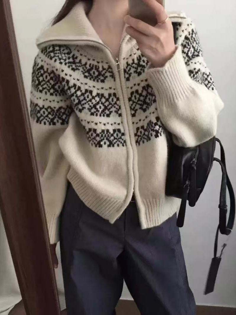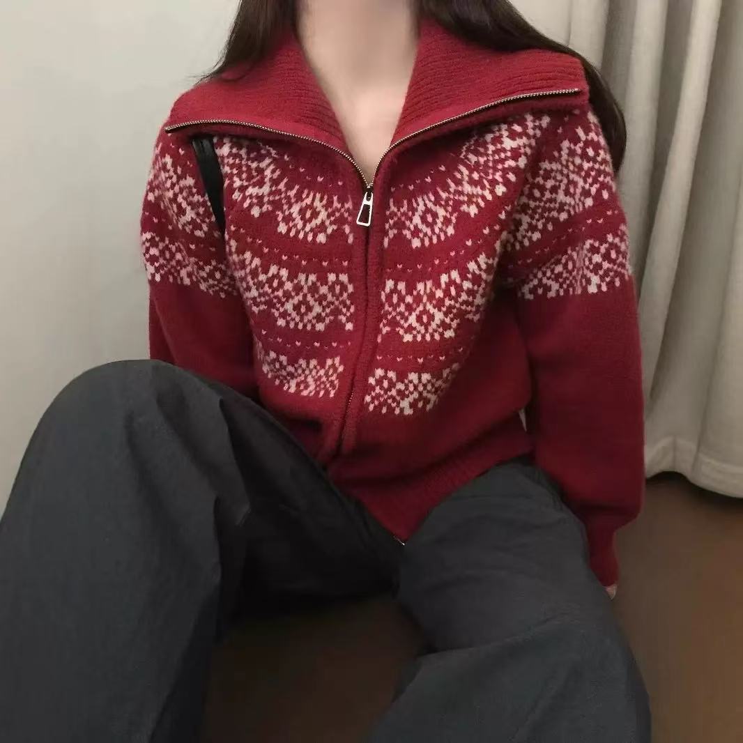 Главная страница > Женский вязаный кардиган Dongdaemun Fair Isle из Южной Кореи с жаккардовыми лацканами, красный новогодний свитер в стиле ретро в ленивом стиле