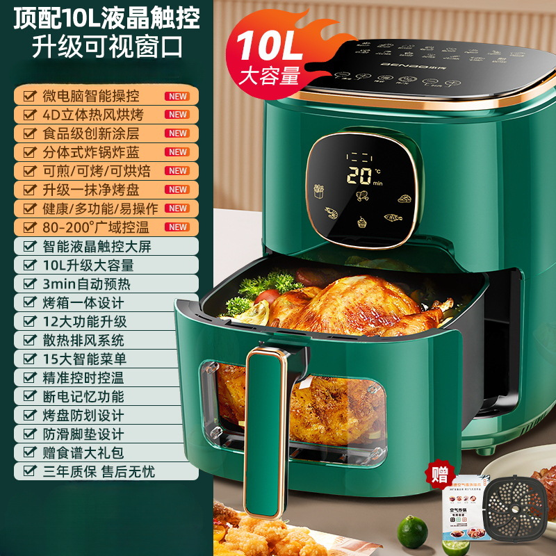 [Топ с сенсорным экраном/зеленый 10,0 л] Модернизированная большая емкость + 15 больших интеллектуальных меню + высокая огневая мощь 1400 Вт + трехмерная выпечка горячим воздухом 4D + без масла и без масла