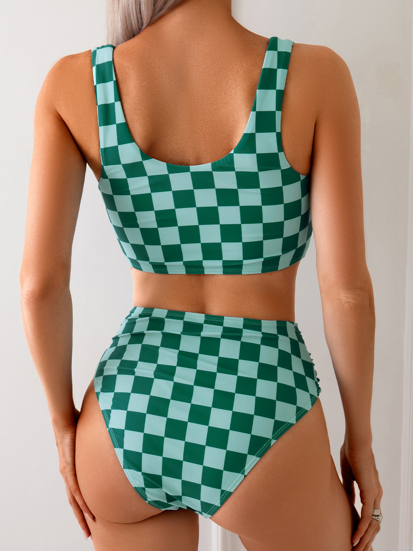 Дропшиппинг из зарубежного склада: женский купальник-бикини с контрастной клетчатой расцветкой, высококачественный, с разрезом, на весь топ.