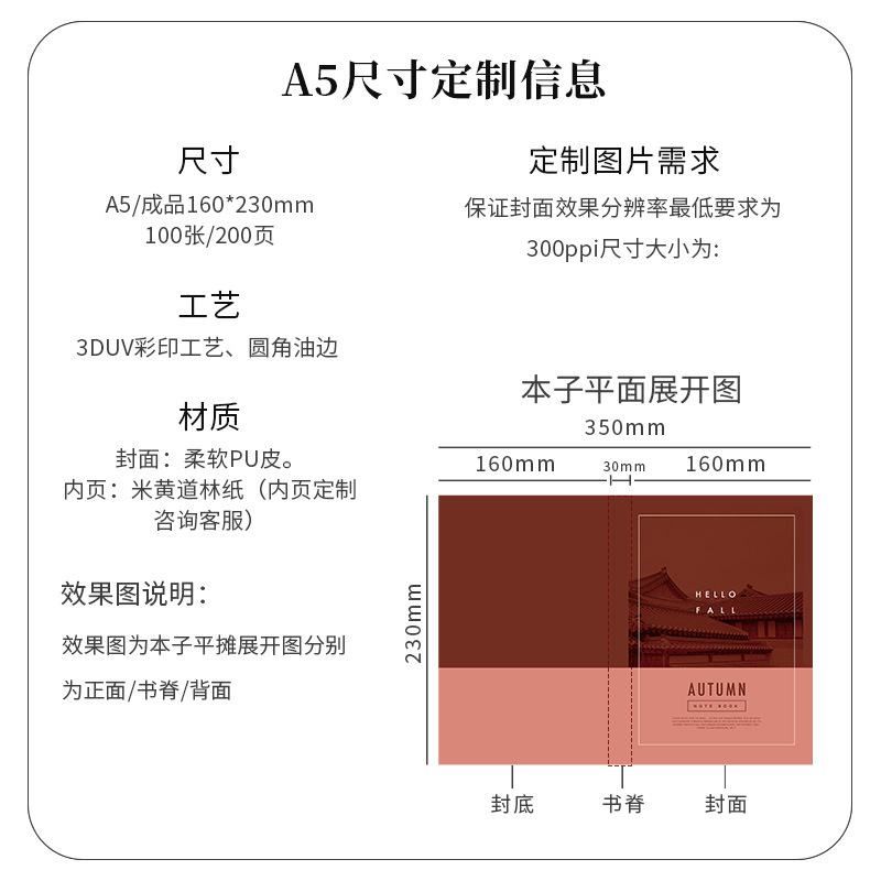 Модель A5 с мягкими обложками, цветной печатью и листами на кольцах [100 г, 100 листов бумаги Dowling]